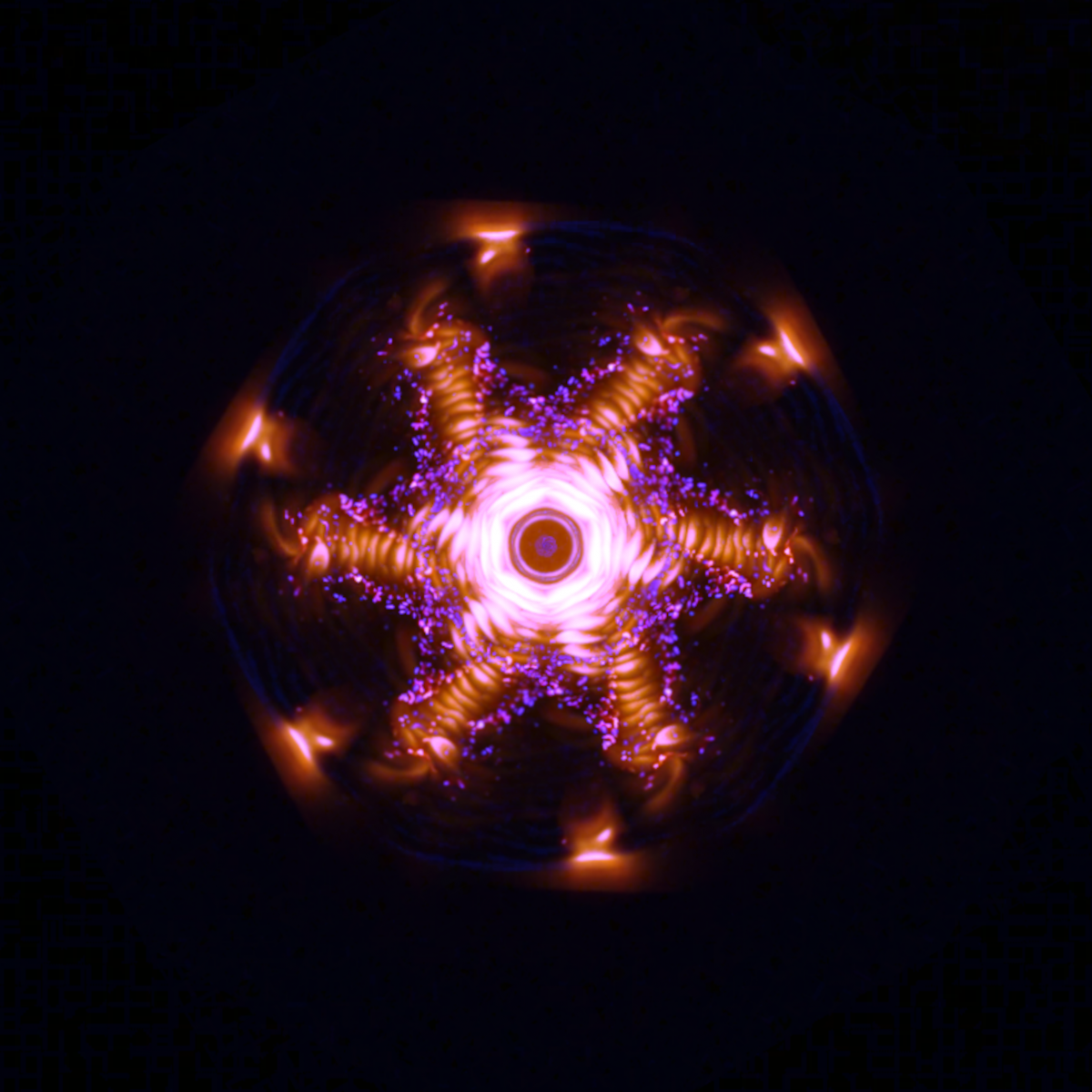 この作品は、狭い空間内で燃え拡がるろ紙のフィンガリング現象を撮影したものです。画像を一定間隔で回転させて画像を重ね合わせています。また、本来はオレンジ色の火炎ですが、色調補正を行い青色に近付けることで鮮やかな紫色の火炎になっています。火炎が渦を巻いているように見え、巴模様を作り出しています。