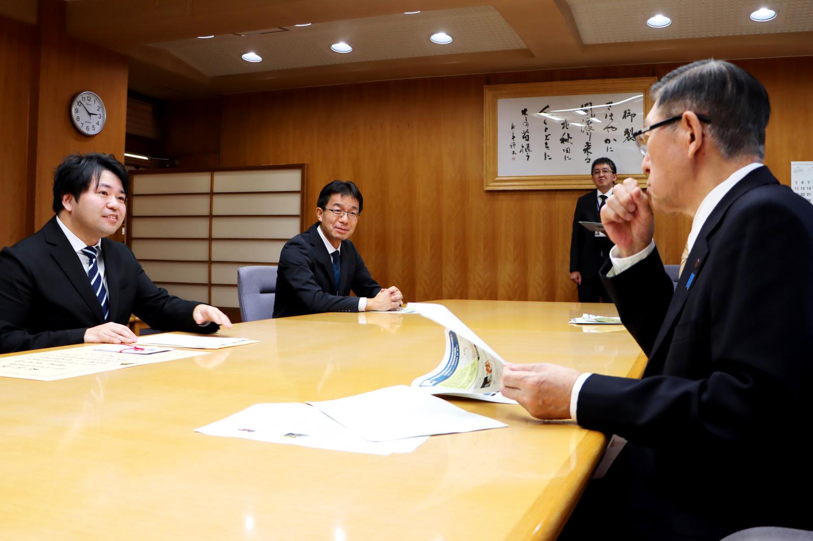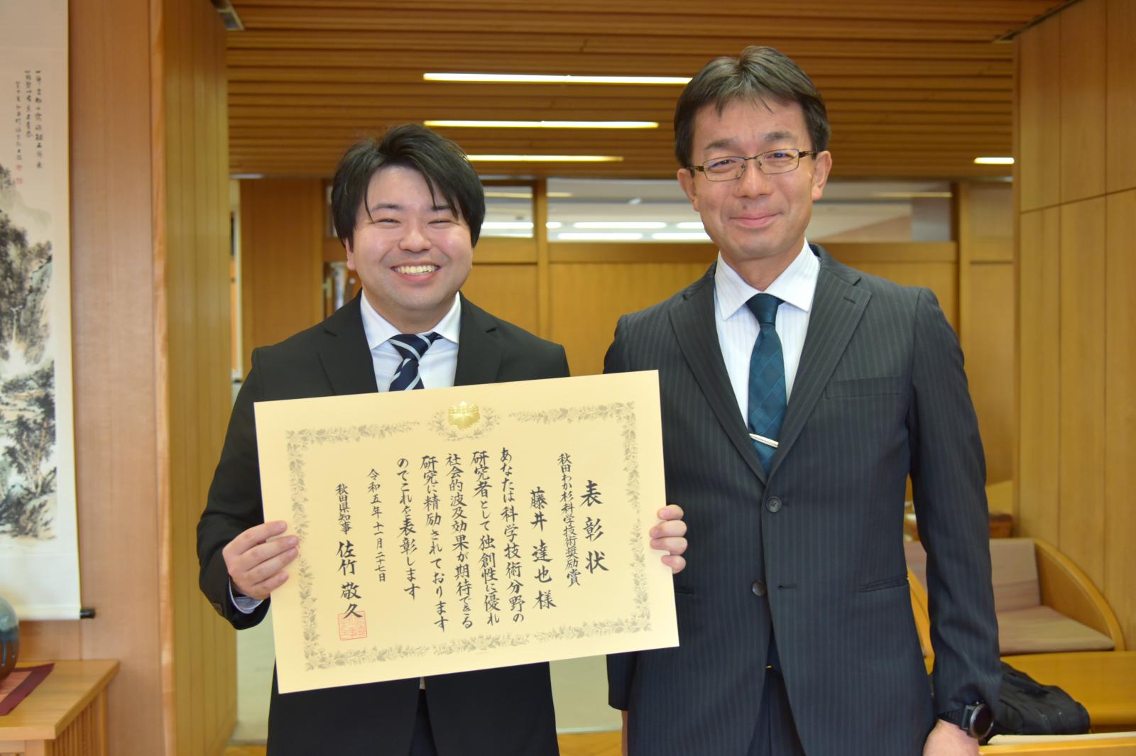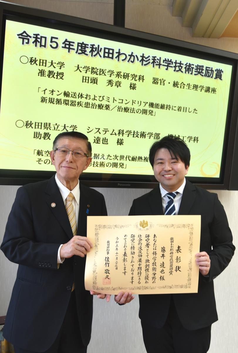 受賞した藤井助教 佐竹秋田県知事と記念撮影