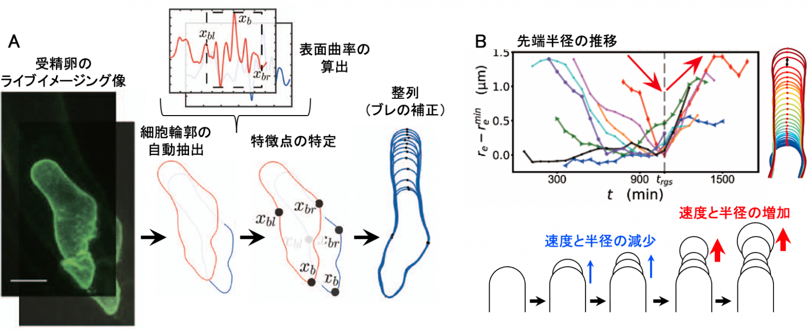 図1(A)イメージ規定標準化法モード図。細胞膜を緑色で蛍光したシロイヌナズナ受精卵のライブング像から細胞輪郭を抽出し、表面曲率をもとに特徴点を特定して整列させることで、 (B)受精卵の先端半径の経過を表したグラフ(上)と、その変化を模式的に示した図(下)。スケールバーは10マイクロメートル(µm) )を表します。
