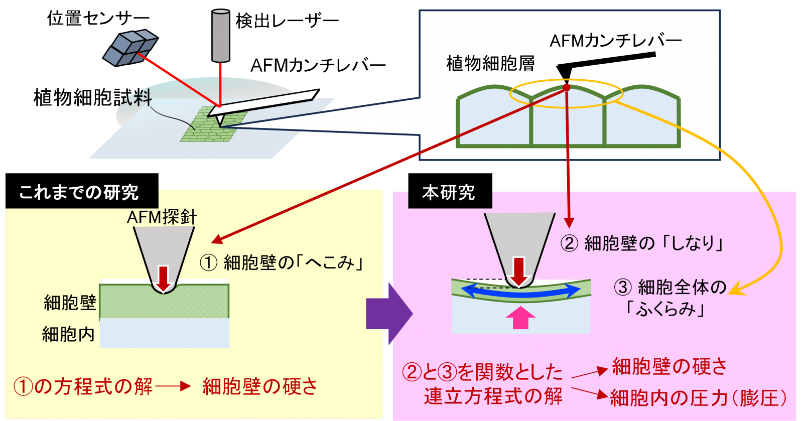 これまで植物細胞の硬さを調べるために、原子間力顕微鏡(AFM)と呼ばれる装置が用いられています(図1)。この装置では、細胞と同程度の大きさの板バネ(AFMカンチレバー)を植物細胞に押し付け、その板バネの感じる力を測定します。板バネの先には細い針(AFM探針)がついており、この針を細胞壁に押し付けたとき、細胞壁をわずかに“へこませる”力を計測し、細胞壁の硬さを推定します。一方、この針を細胞壁に強く押し付けたとき、細胞壁は“へこむ”だけでなく、細胞壁全体が細胞の内側に“しなり”ます。本研究では、これまでの研究でほとんど注目されていなかった、この“しなり”に注目しました。“しなり”を起こしたときに板バネが感じ取る力は、細胞壁の硬さのみならず、膨圧の強さも含まれています。このため、板バネが感じる力を計測するだけでは、板バネが細胞壁の硬さか膨圧か、どちらを感じているかの区別がつきません。 そこで本研究では、膨圧により生じる植物細胞の“ふくらみ”に注目しました。このふくらみと板バネが感じる力の2つの計測値を、膨圧と細胞壁の硬さの2つの特性値に変換する方法を考案したのです。細胞壁のふくらみについては、細胞壁の表面を原子間力顕微鏡の針のついた板バネでなぞることにより測定できます。 本研究では、この2つの計測値と2つの未知数(細胞壁の硬さと膨圧)の関係を示す2つの方程式を、建築学の理論をつかって組み立てました。この2式の連立方程式を解くことにより、この2つの未知数を推定する処理方法を構築しました。この方法により、原子間力顕微鏡による計測だけで、生きた細胞の細胞壁の硬さと膨圧を同時に知ることができる新しい方法を確立しました。今後の展開