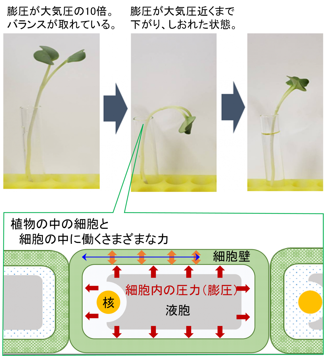 図 2. 細胞内の圧力(膨圧)と細胞壁の硬さのバランスで変化する植物の形態