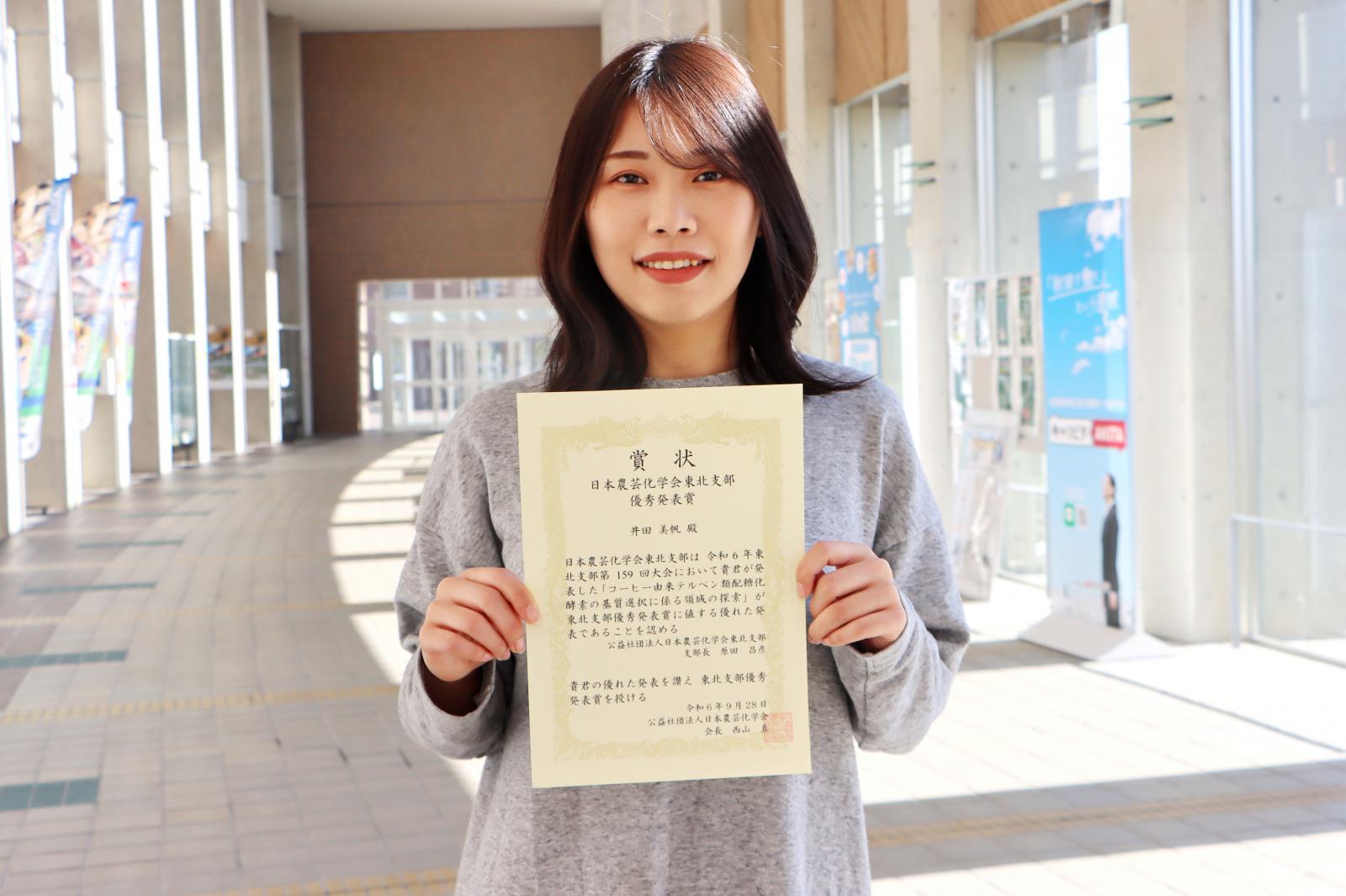 この度、生物生物資源科学研究科 生物資源科学専攻 博士後期課程3年の井田 美帆さん(応用生物科学科/植物機能グループ) 【指導教員:水野 幸一 教授[植物代謝化学]】が、福島大学で開催された「日本農芸化学会東北支部第159回大会」で研究発表を行い、学生優秀発表賞を受賞しました。前回大会に引き続き、2年連続での受賞です。おめでとうございます!!本研究成果は、Elsevier社が出版する英国の国際学術誌、