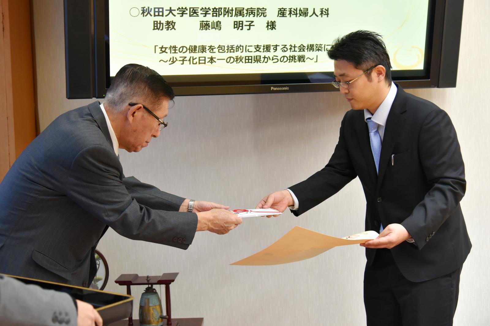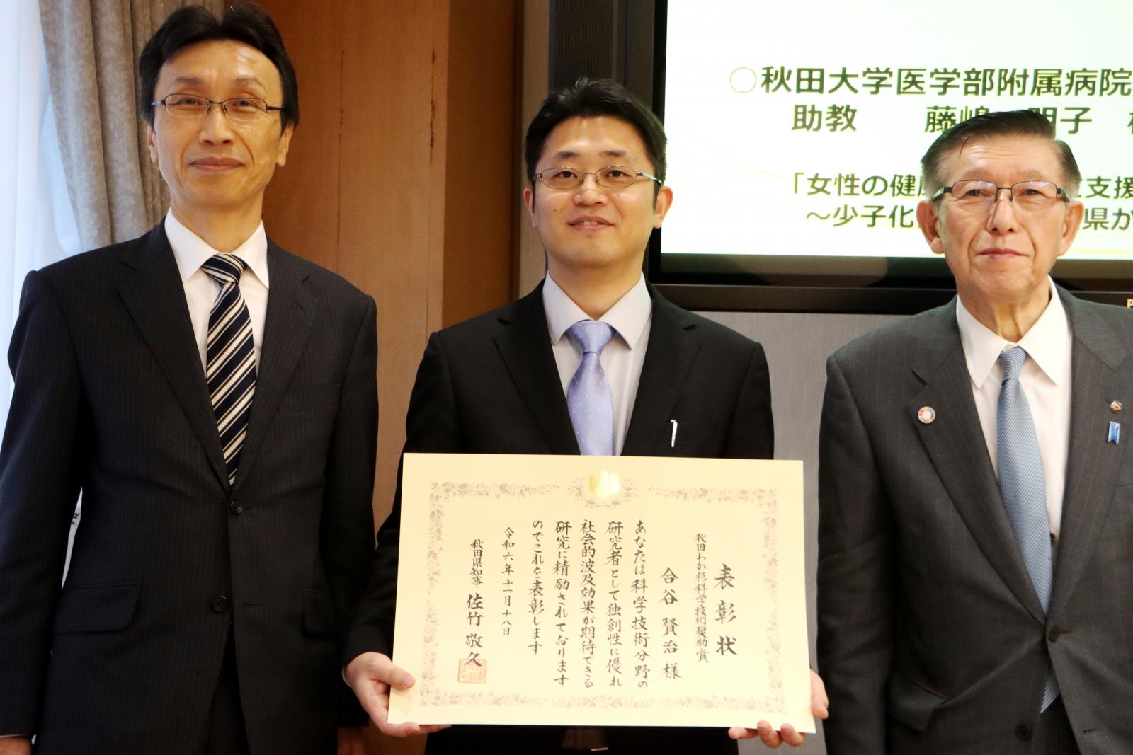 受賞した合谷助教 佐竹秋田県知事と記念撮影