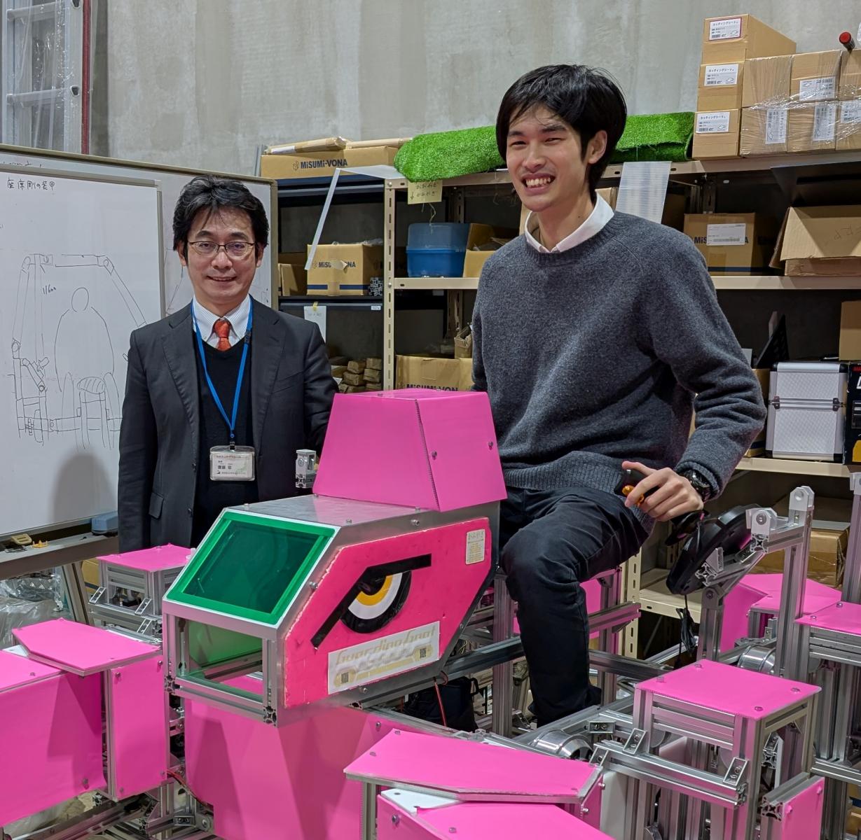 長谷山直飛さんと齋藤敬教授、そして受賞プランの「動物型ロボットかかし」搭乗仕様