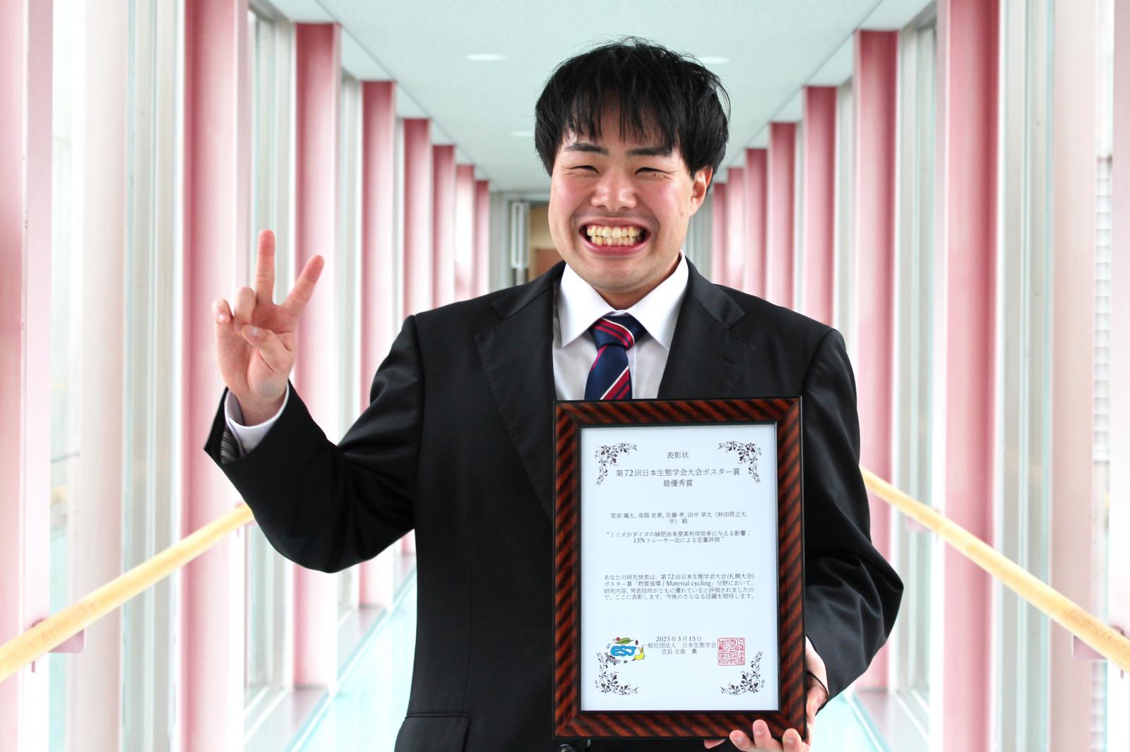 令和7年3月15日~18日に札幌コンベンションセンターで開催された、第72回日本生態学会大会において、生物資源科学研究科・博士前期課程2年/土壌環境学研究室の菅原 颯太さんがポスター発表を行い、見事、ポスター賞「最優秀賞」を受賞しました。今回の最優秀賞は、応募総数546件の中から16件(上位3%未満)のみが受賞し、各分野で最も高い評価を受けた1件に送られるもので、菅原さんは「物質循環 / Material cycling」分野において、研究内容および発表技術が優れていると高く評価されました。