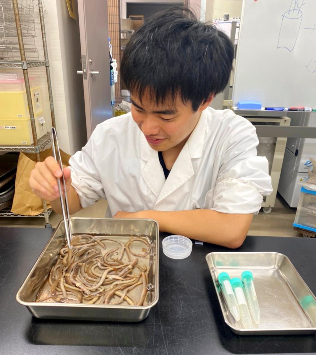 このような素晴らしい賞をいただき、本当にありがとうございます。私がミミズに興味を持ったきっかけは、学部3年次の研究室訪問です。研究室配属後から本格的にミミズについての研究を始めました。先生方や土壌環境学研究室の皆様のお力添えがあり、ここまで研究を進めることができました。ミミズは土壌を物理・化学的に改変することにより、作物収量を高めることが示唆されています。今回の受賞ポスターの内容は、農地におけるミミズの生態や機能を明らかにしようとする研究成果の一部です。農地におけるミミズの生態や機能については、まだ広く知られていないことが多いです。今後は農業分野への就職が決まっているため、私が感じたミミズの素晴らしさを多くに人に伝えることで秋田県の農業に貢献していきたいと考えています。受賞した菅原 颯太さん