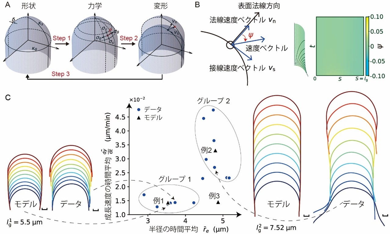 植物細胞の成長パターンは 2 つのタイプに分類でき、細胞表面全体が成長する拡散成長と先端のみ成長する先端成長があります。先端成長様式をもつ器官や細胞の例としては、ヒゲカビなどの菌類やシャジクモ仮根などの藻類器官に加え、被子植物の根毛や花粉管などが挙げられ、これまで多くの細胞で成長部位や成長速度が特定されてきました。著者らの先行研究において、被子植物であるシロイヌナズナの受精卵も先端成長様式であることが明らかにされていましたが、一細胞である受精卵がどのような仕組みで先端成長を達成しているかは詳しくわかっていませんでした。このような生物学的な研究発展がある一方で、数理物理学分野では、細胞壁の変形を考慮した細胞力学モデルが考案されており、実際の細胞成長中の形状、細胞表面の力学、細胞壁変形様式を同時進行的に分析することが可能になっていました。そこで本研究では、実験データで得られる受精卵形状データと細胞力学モデルを相互参照することで、受精卵がどのような力学的原理を使って先端成長を達成しているかを解き明かすことを目指しました。本研究の成果