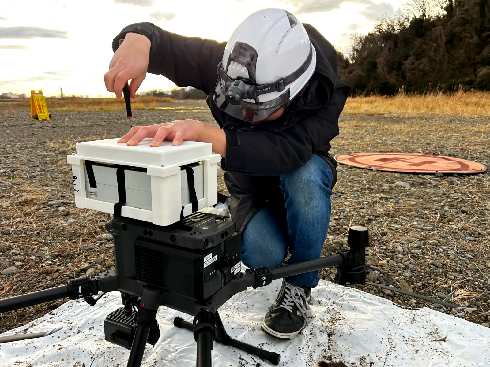 今回、ドローンの機材調整や飛行などを担ったのは、本学システム科学技術学部 建築環境システム学科の卒業生で、株式会社東北ドローンで活躍する脇坂 翔吾さん(指導教員:板垣直行教授)です。頼もしい卒業生が、プロジェクトの推進に大きく貢献しています!ドローンを点検する脇坂さん