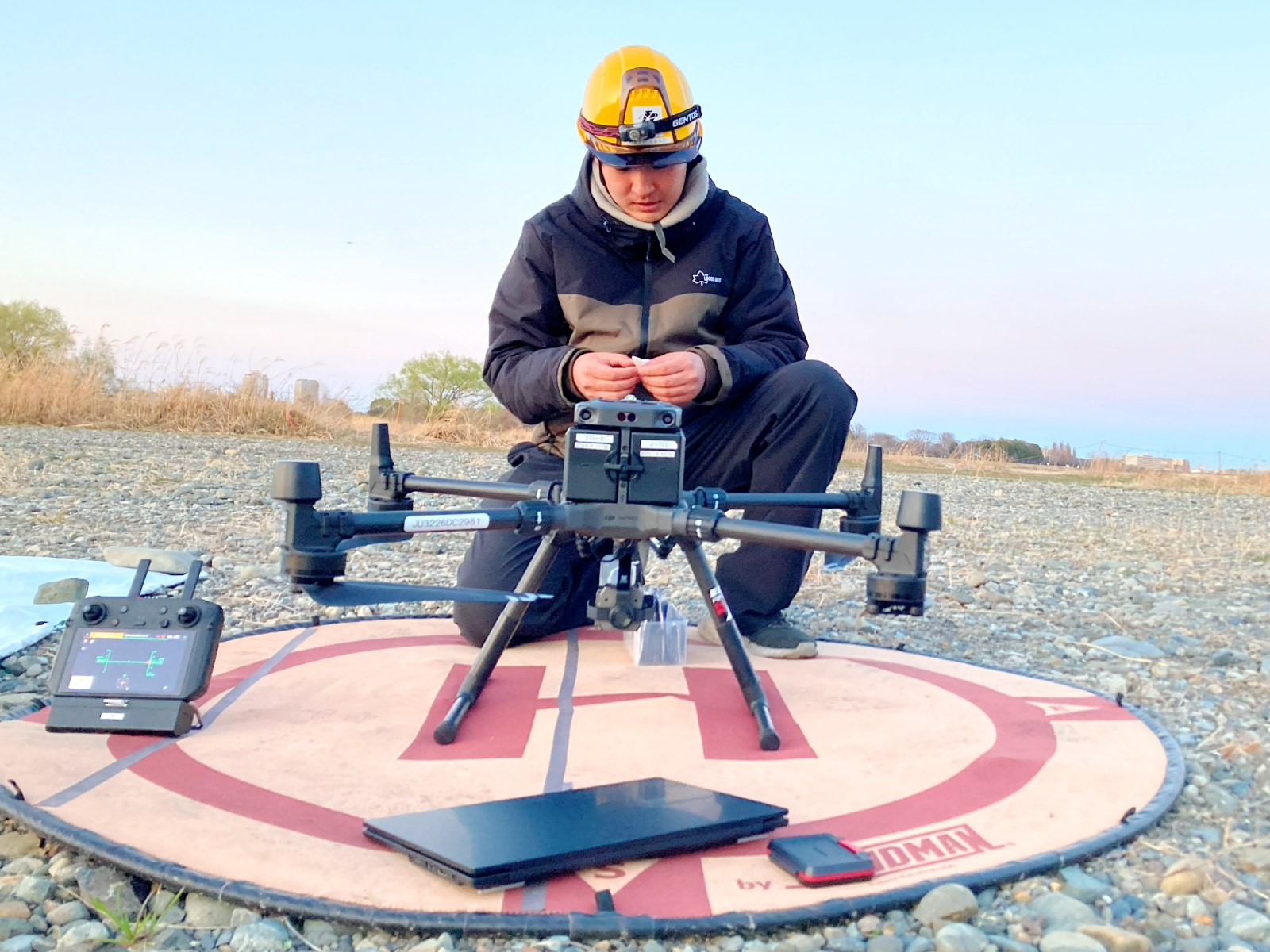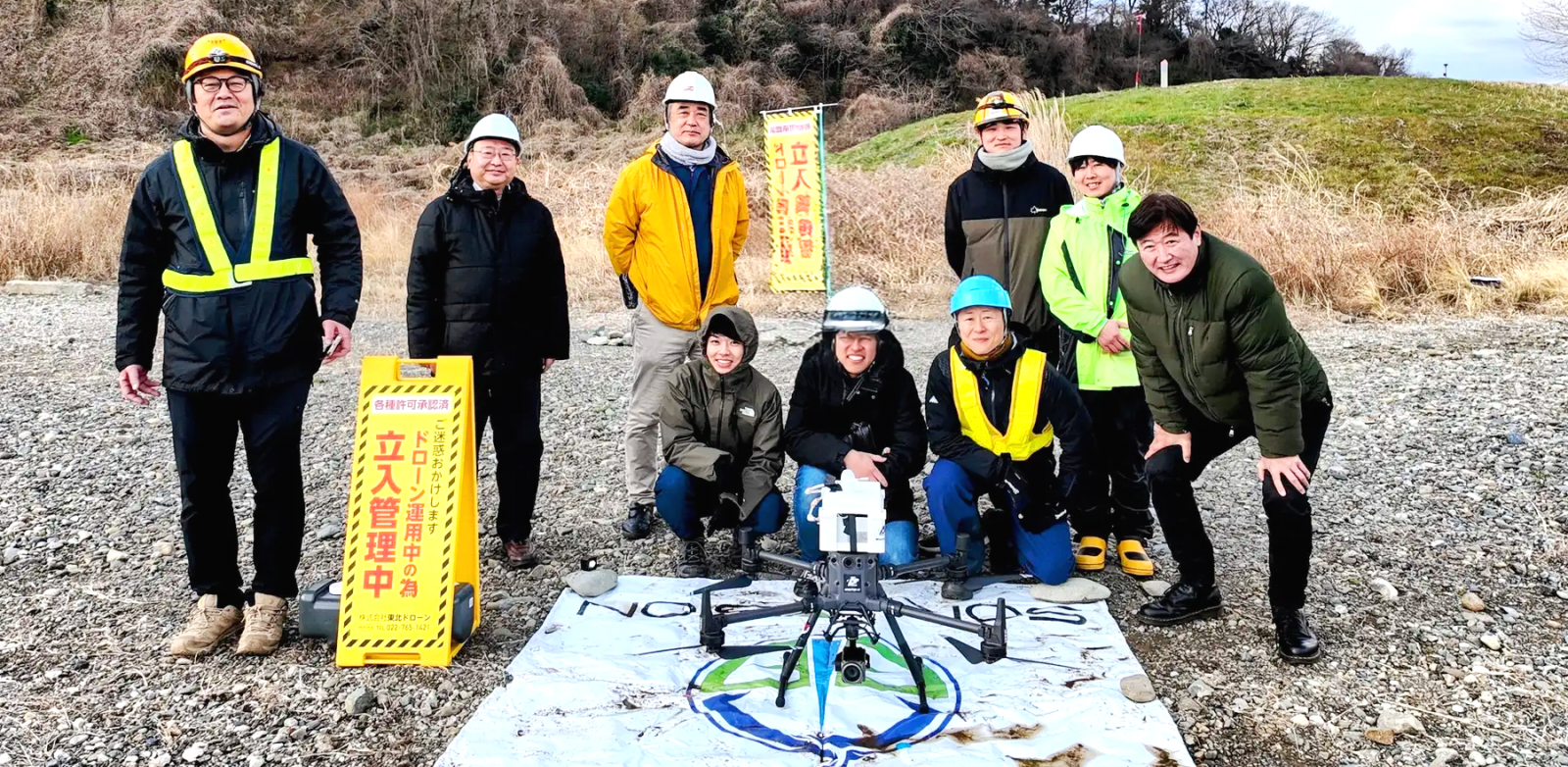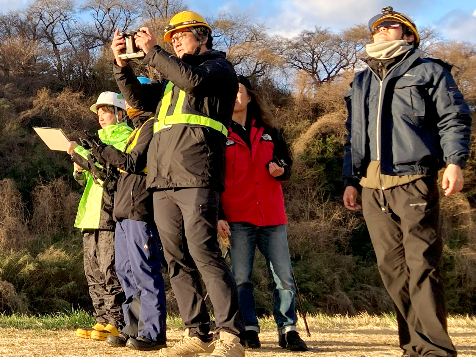 ドローン観測の専門家チーム(右から2人目の白いヘルメットが生物環境科学科 井上 誠 准教授)