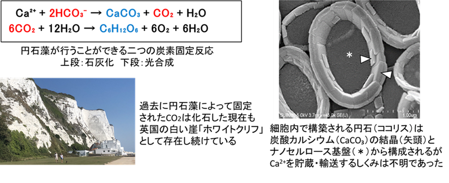 円石藻は海洋の主要な植物プランクトンであり、海水に溶けた二酸化炭素(正確にはHCO3-)とCa2+を結びつける石灰化反応によって炭酸カルシウムから成る円石(ココリス)を生産することで二酸化炭素を固体へと隔離する役割があります(図1)。その遺骸は海洋堆積物(石灰岩)として大量の二酸化炭素を隔離し、生物地球化学的循環において重要な役割を果たしてきました。円石藻の石灰化に重要なCa2+の輸送メカニズムは、Ca2+濃度を制御しながら、必要量のCa2+を供給する仕組みが必須ですが、以下のことが明らかになっていました。(1)細胞膜のイオンチャネルを介して海水からCa2+を細胞内に取り込む