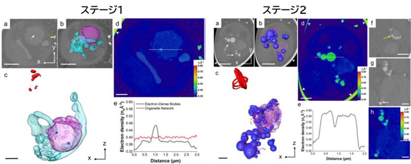 細胞内(石灰化ステージ1、 2)のクライオPXCT像(a:白黒画像)と立体構築したイメージング画像(b, c:カラー画像) 。構造体(Ca-rich compartment)が水色から紫色、紫色から青色へと動的に変化していく様子が見られた。dとeは構造体の電子密度を測定したもの。赤色は細胞表層に配置された円石を示す。
