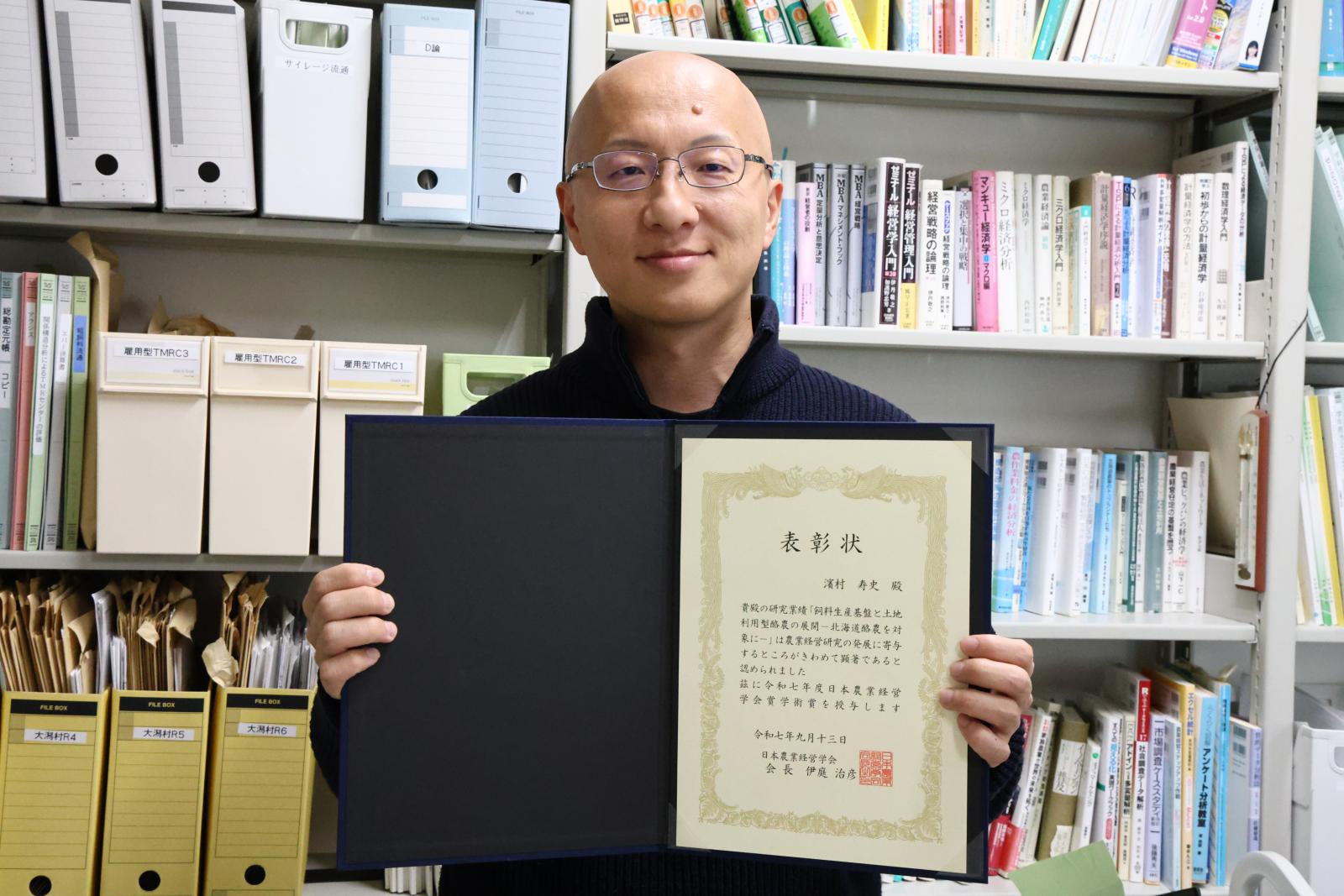 日本農業経営学会において、アグリビジネス学科政策・経営マネジメントプロジェクトの濱村寿史准教授[専門:農業経営学]が学術賞を受賞しました。濱村准教授は、農業経営の実態調査を通じて、低コスト・高収益な農業のあり方などについて研究を進めており、これらの研究業績が高く評価され本賞の受賞につながりました。