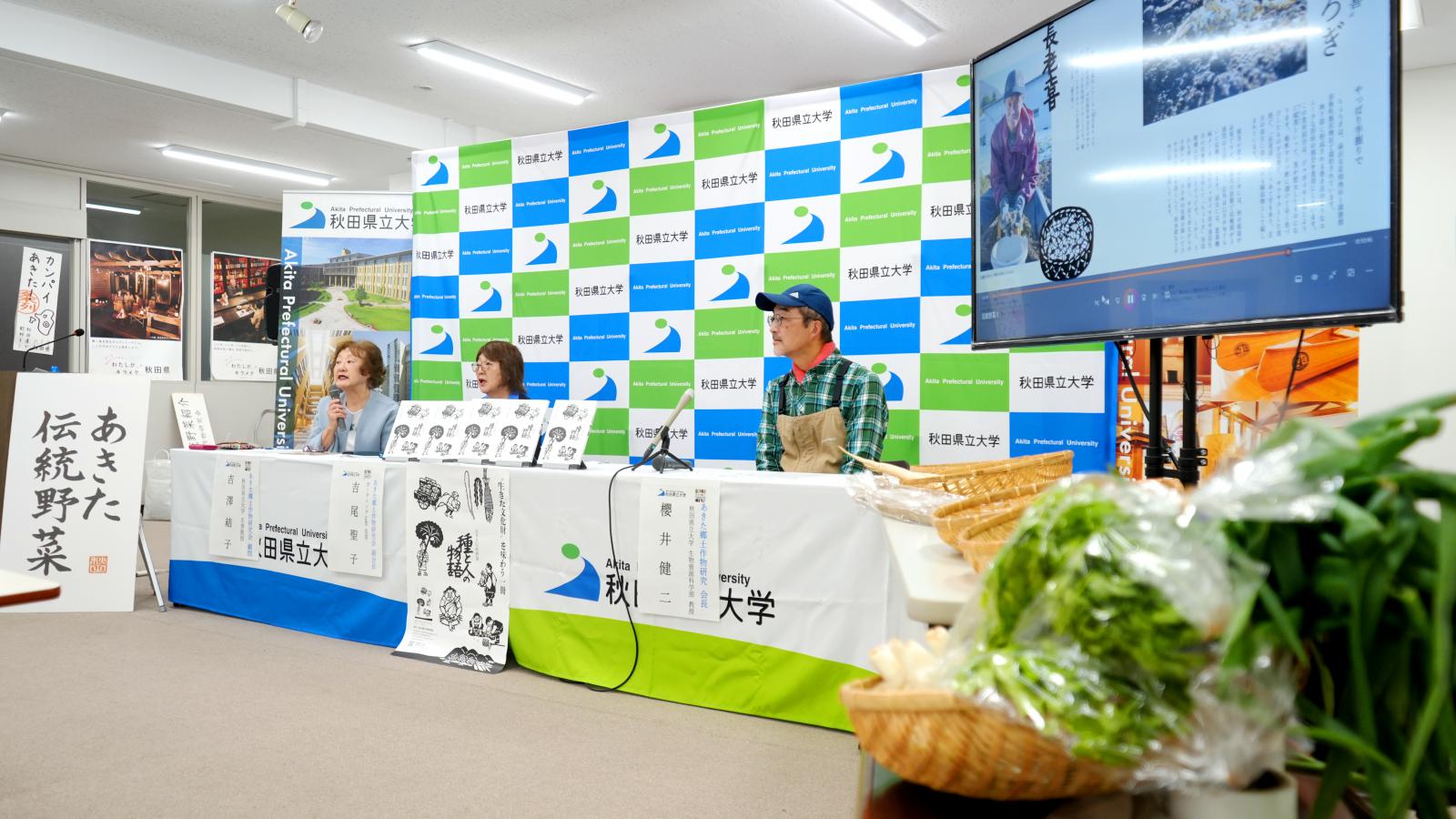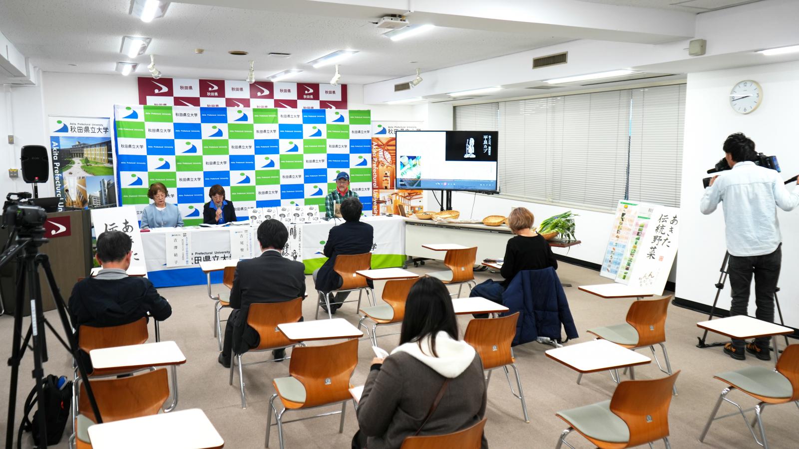 この度、研究会では秋田県内で受け継がれる伝統野菜の今昔を豊富な写真とともに紹介する書籍『あきた伝統野菜「種と人の物語」』を出版し、その成果発表会を令和7年10月27日(月)に秋田県庁で開催しました。発表会では、多種多様な色彩を持つ伝統野菜の現物と、継承されてきた貴重な種のコレクションを展示し、報道機関の皆様に実際にご覧いただきながら、書籍を通じて秋田の郷土作物の伝統が未来へ継承される重要性について紹介しました。