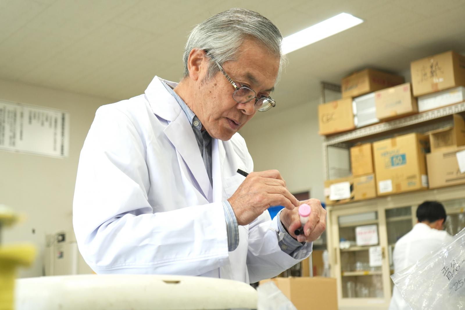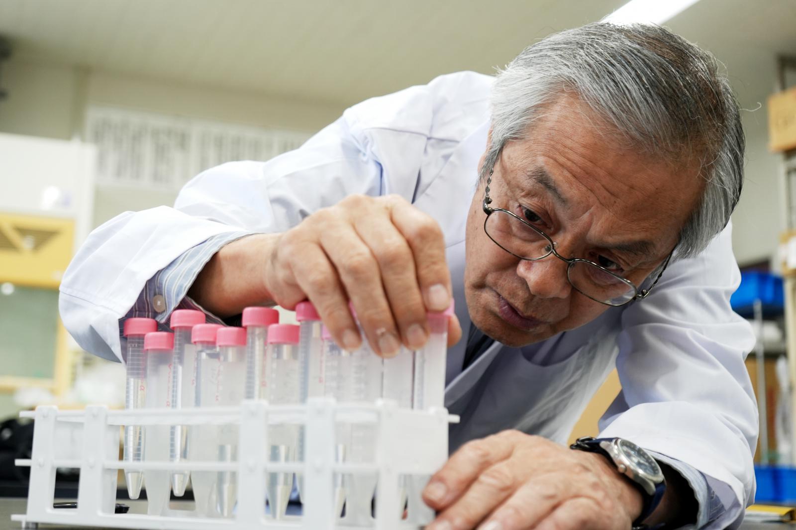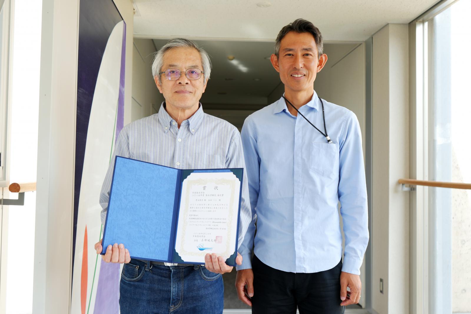 1ヶ月後に初めて担任した生徒たちの還暦の会があるというタイミングで受賞できて大変感激しております。この研究テーマは、49年前、山形大学理学部に在籍中、普通河川のトビケラの生活史に関する卒論研究の指導者であった横山宣雄先生から、「強酸性で有名な玉川温泉の流入河川には普通河川と全く異なる昆虫がいる」との情報をいただいたことが発端です。その2年後、中学生を連れて一緒にその川に調べに行きました。果たして、先生の話された通りの見たことのない幼虫がたくさんいる不思議な世界でした。直ぐにでも調査したいと思いましたが、大曲の自宅から車で往復4時間もかかるので、在職中は調べたいと思っても行く余裕はありませんでした。退職後、満を持して、調査に通い始めました。3年間調査を続けました。(※甲子園で金足農業高校の試合がある日は朝4時に起きました。)しかし、成虫がほとんど採集されず、雪解け前から初雪が降る頃まで孵化直後の1齢幼虫がみられるなど、いつ何回羽化するかさえ分からず、データの解析に頭を抱えました。これまで手掛けたトビケラとは全く異なり、本種の生活史の解析は、落とし物を拾いに行くような感じでした。そのときに、共著者になってくださった谷田一三先生(日本産水生昆虫検索図説の編者)から海外に同期性の低いトビケラがいることの情報など、多くの有益なご助言をいただいたことで、闇を脱し、前に進むことができました。実は、その谷田先生も横山先生と親交があり、谷田先生が座長をされた研究会に横山先生と一緒に参加した当時学生だった私のことを覚えていてくださって、44年後に学会でお会いした時に声をかけてくださったのでした。皆さんも、研究を通した人とのつながりを大事にしてください。いつかきっと、そのつながりが役に立つことがあると思います。いつも、多くのアドバイスをいただき、親身になって相談に乗ってくださる早川敦先生、そして、こんな年になっても好きなことをやらせてくれている妻にはとても感謝しています。[左]受賞した青谷 晃吉さん [右]早川 敦 教授