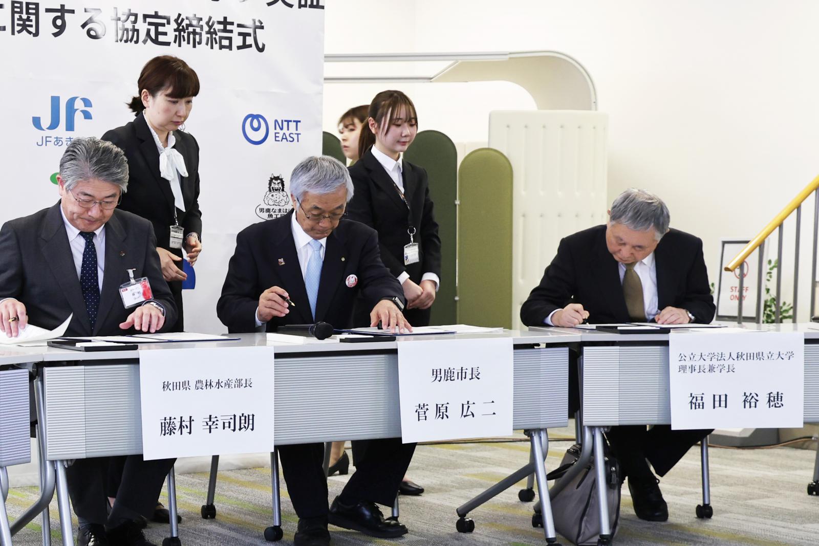 令和7年11月18日、秋田県立大学(理事長兼学長 福田 裕穂)は、男鹿市(市長 菅原 広二)、秋田県(知事 鈴木 健太)、秋田県漁業協同組合(代表理事組合長 杉本 貢)、株式会社男鹿なまはげ魚工房(代表取締役社長 澤村 誉)、NTT東日本株式会社 宮城事業部(執行役員宮城事業部長 須藤 博史)と連携し、男鹿海洋エリアにおけるブルーカーボン実証プロジェクト等に関する協定を締結しました。本協定は、6者が連携して、男鹿市の豊かな自然環境や漁場といった地域資源を活かし、環境にやさしいまちづくりと脱炭素の実現を目指しています。また、観光・農林水産業の振興や地場産業の活性化を図りながら、海藻資源の維持・再生・拡大によるブルーカーボンの推進と地域ブランド力の向上にも取り組みます。