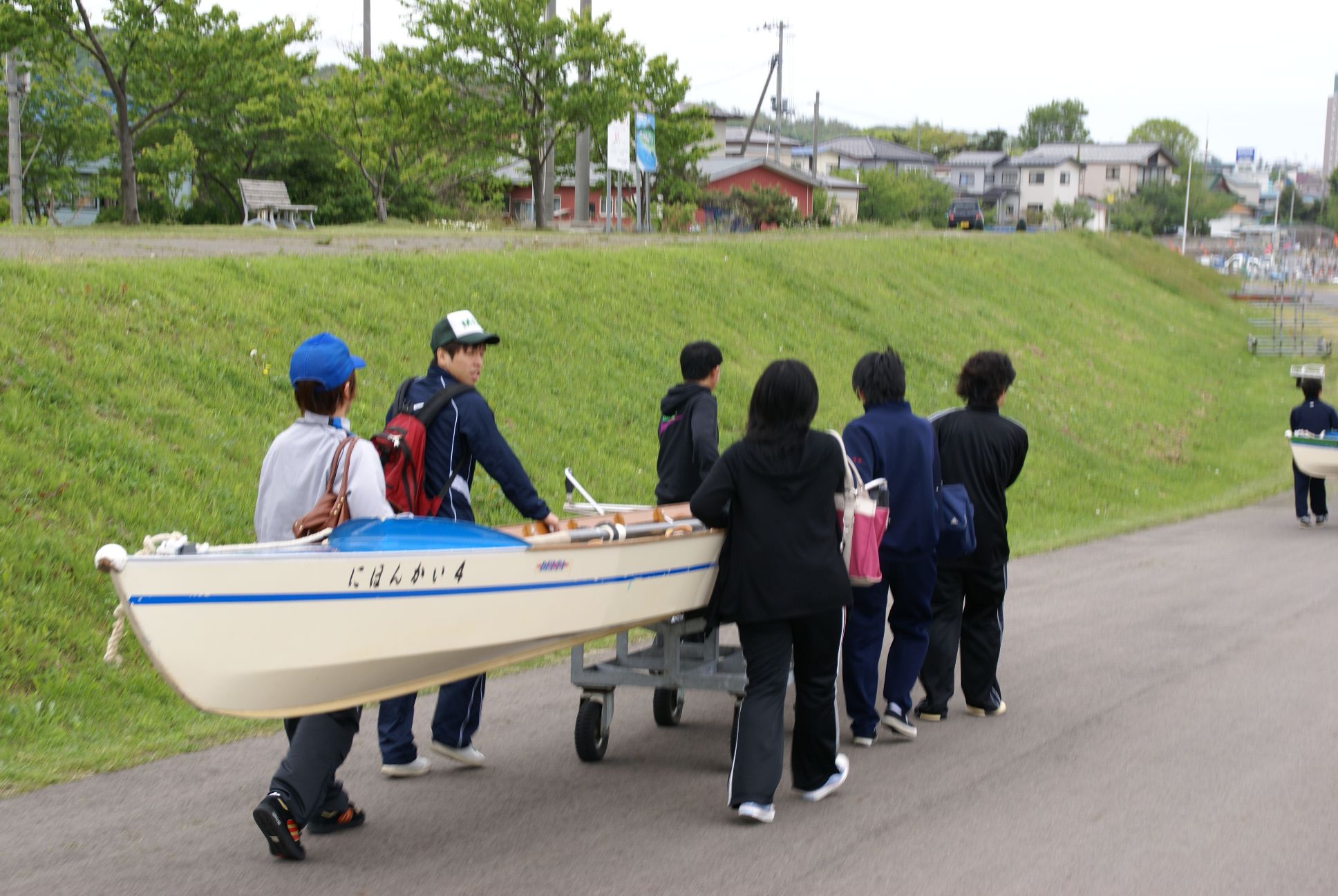 みんなで協力して、ボートを運びました。もう2回目だから慣れたかな?