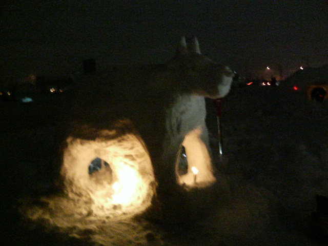 私は一生懸命ミニかまくらを作りました.ミニかまくらにろうそくを入れて,灯をともすと...