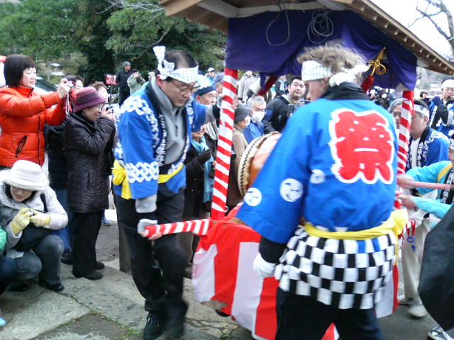 鱈は大きなもので15キログラムくらいあるそうです.これを漁港から神社まで約2キロメートルの道のりを担いで運んできます.次々鱈を担いだ人たちが神社の石段を登って行きました.