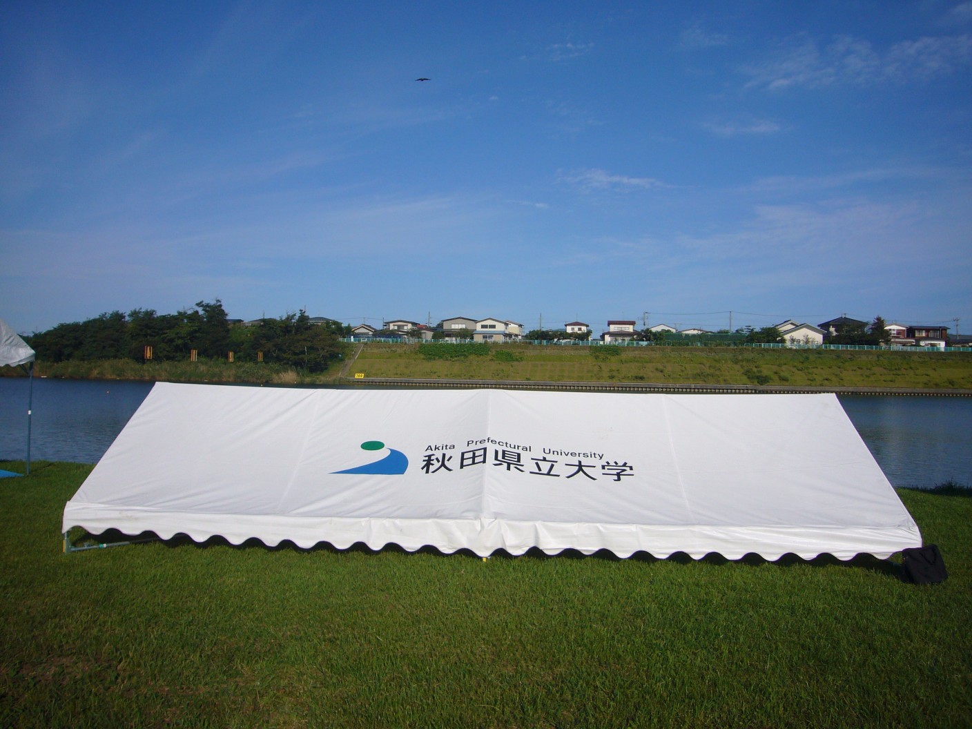 子吉川河川敷(アクアパル前の広場)に秋田県立大学と書かれたテントを設営していますので気軽にお越しください。
