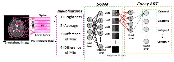 本研究では,教師なし学習のSOM(Self-Organizing Maps)とART(Adaptive Resonance Theory)をハイブリッド化し,頭部MR(Magnetic Resonance)画像における輝度特性や輝度分布のみから脳組織を分類する手法を提案します. 本手法では,脳萎縮を定量化するためにSOM で高粒度の組織分類を行い,組織分類した結合荷重を基にART を用いて細分化した組織の領域を統合します.実験から,灰白質は脳脊髄液と白質の境界に沿う連続した帯状の領域を形成し, 脳脊髄液は高輝度領域に沿って正しく抽出でき,解剖学的構造情報に沿った結果が得られました.これからはPSO(Particle Swarm Optimization)を用いてSOMのユニット数とARTのビジランスパラメータを最適化します.