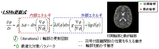 本研究では,LSM(Level Set Method)とAAM(Active Appearance Model)を使い,頭部MR画像の脳領域を抽出する手法を提案します.本手法は,脳領域を抽出するためのLSMのパラメータを従来では手動で設定していたが,パラメータの組み合わせが膨大なために手動で最適なパラメータの組み合わせを見つけることは困難であるため,生物の進化における遺伝のメカニズムに似た操作を取り入れたアルゴリズムであるGA(Genetic