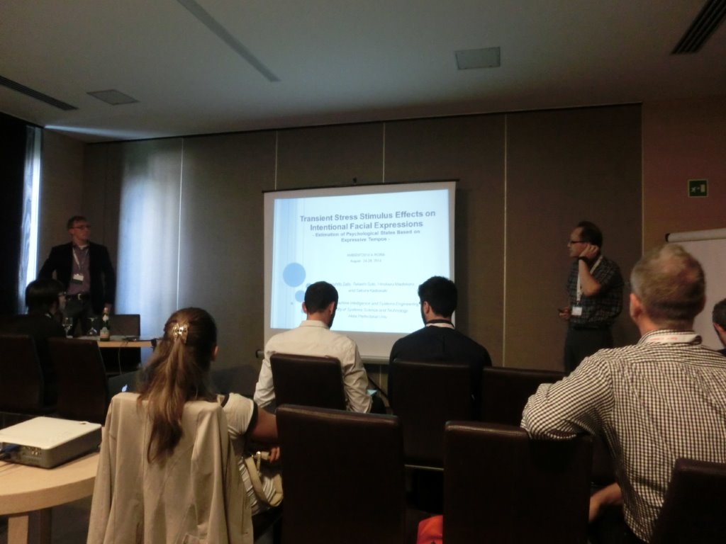 が挙げれる。私は,(2)の人間の状態推定技術に焦点を当て,口頭発表を行った.特に,表情の表出プロセスに着目した表出テンポとリズムのフレームワークを提案し、情動喚起ビデオ視聴による一過性ストレス刺激と意図的表情との関係性を定量的に示した。また、表情の印象を形成する顔部位(顔全体/顔上部/顔下部)間の相互情報量の順序性に着目することで、より自然な印象を与える魅力的な笑顔と不自然な偽り笑顔の分別可能性を示した。今後は、顔部位(顔全体/顔上部/顔下部)間の相互情報量の順序性に焦点を絞込み、提案手法の有効性を検証する。