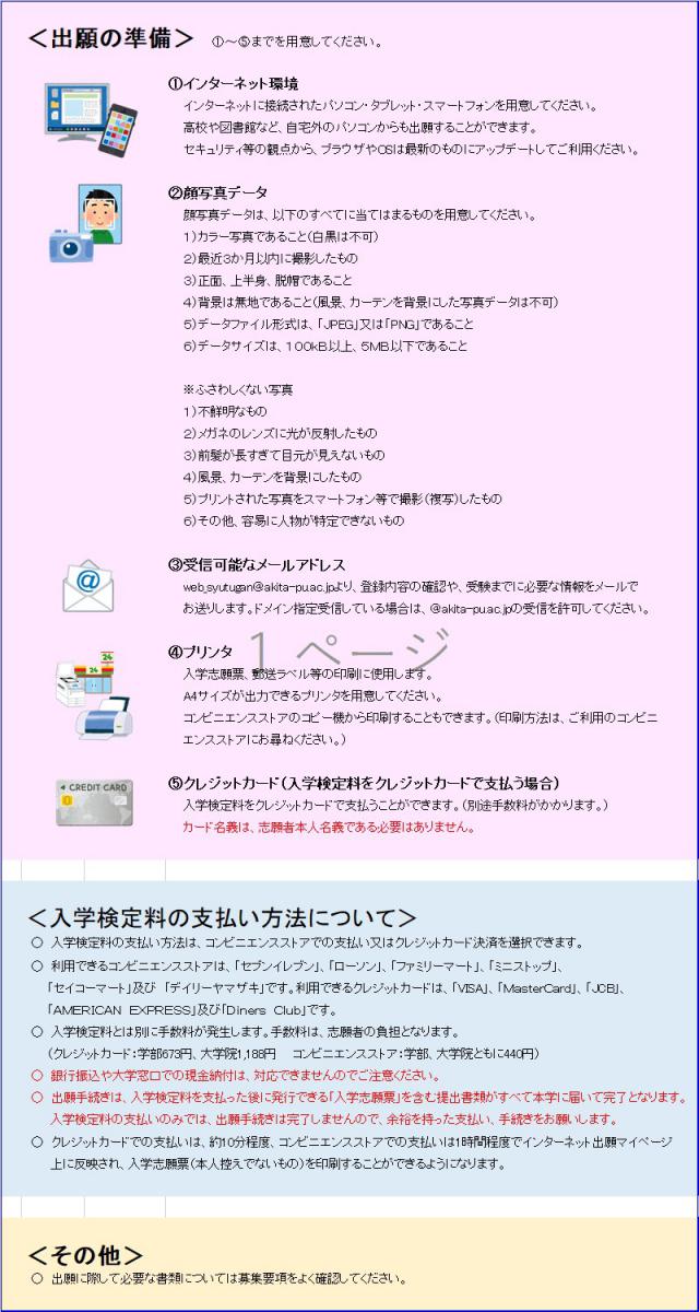 秋田県立大学の入学者選抜は全て、インターネット出願となります。(提出が必要な書類もあります。)また、入学検定料の支払い方法がクレジットカードによる支払いもしくはコンビニエンスストアでの支払いとなります。