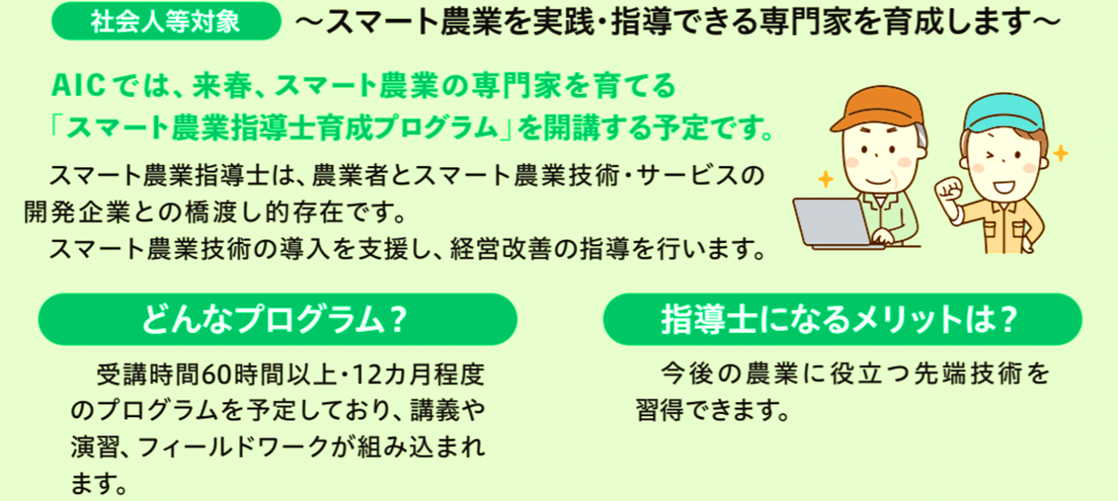 スマート農業指導士とは 『スマート農業指導士』とは、秋田県立大学が認定する独自の資格です。スマート農業において必要とされる新たな知識・技術・技能を支援・指導できる人材を養成すべく、カリキュラムの履修やレポート提出等の条件を満たして修了された方に授与されます。