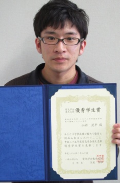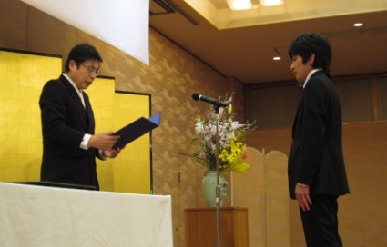 | 卒業祝賀会での受賞の様子 | 受賞者の山内さん | 贈られた表彰状 |