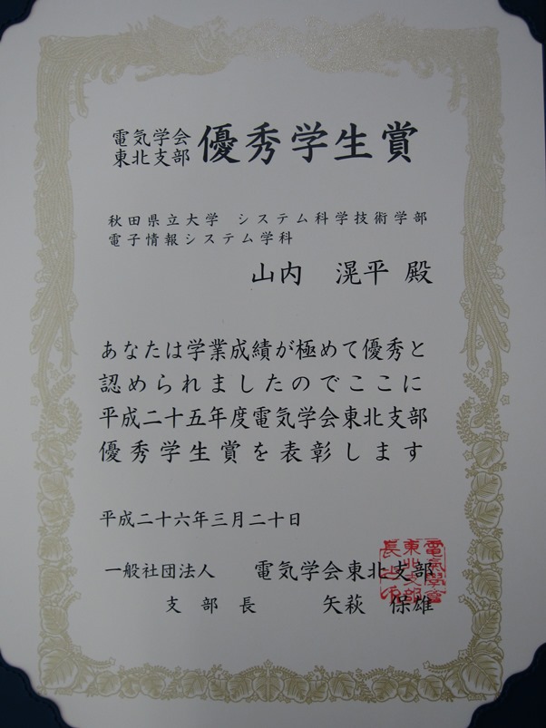 本学大学院電子情報システム学専攻1年の山内滉平さん(指導教員:徐粒教授)が、電気学会東北支部優秀学生賞を受賞しました。