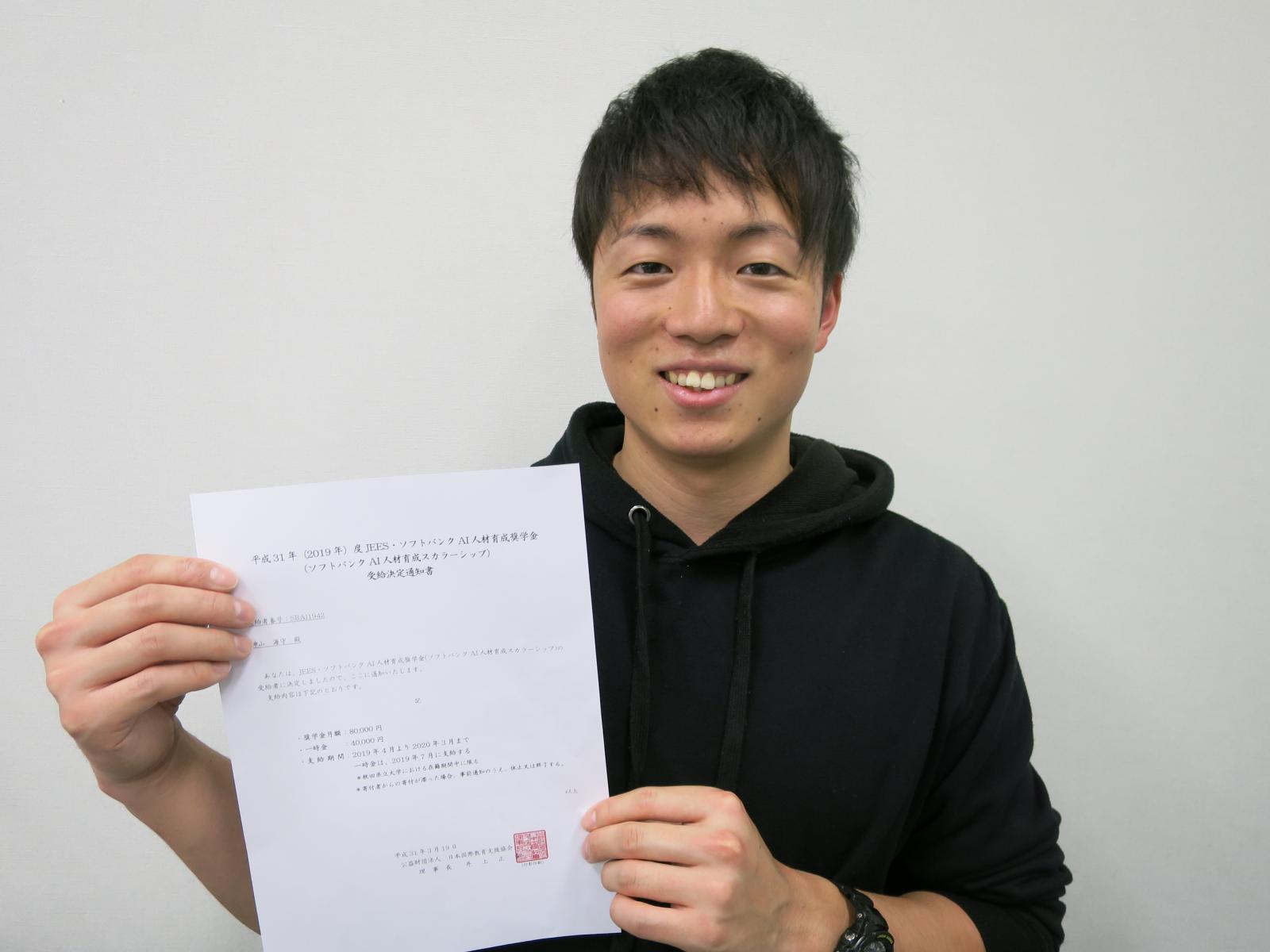 システム科学技術研究科機械知能システム学専攻1年の神山海守さん(指導教員:間所洋和准教授)が「ソフトバンクAI人材育成スカラーシップ」の奨学生に見事内定いたしました。このプログラムは、AIがより幅広く活用されていく時代を見据えて、今後の各産業の発展を担う「AI人材」の育成に貢献することを目的とした奨学金制度です。