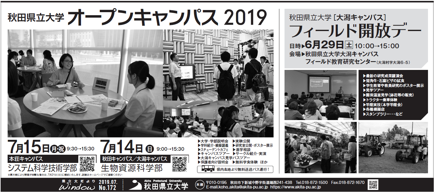 秋田魁新聞に本学の広告を掲出しました 6月28日(金)付け秋田魁新聞に、『フィールド開放デー2019』及び『オープンキャンパス2019』について、広告を掲出しました。是非、ご参加くださいますようお願い申し上げます。 ここをクリックすると記事広告をご覧いただけます。 ※フィールド開放デー及びオープンキャンパスの概要は、以下をご覧ください ◆フィールド開放デー2019 ◆オープンキャンパス2019