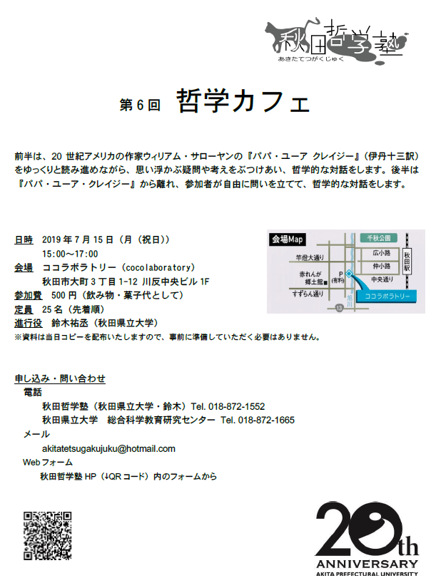 本学総合科学教育研究センターでは、哲学を通じた地域貢献活動として、「秋田哲学塾(代表:鈴木祐丞助教)」を主催しております。その一環として、令和元年7月15日(月・祝日)、秋田市川反のココラボラトリーにおいて、哲学カフェを開催いたします。