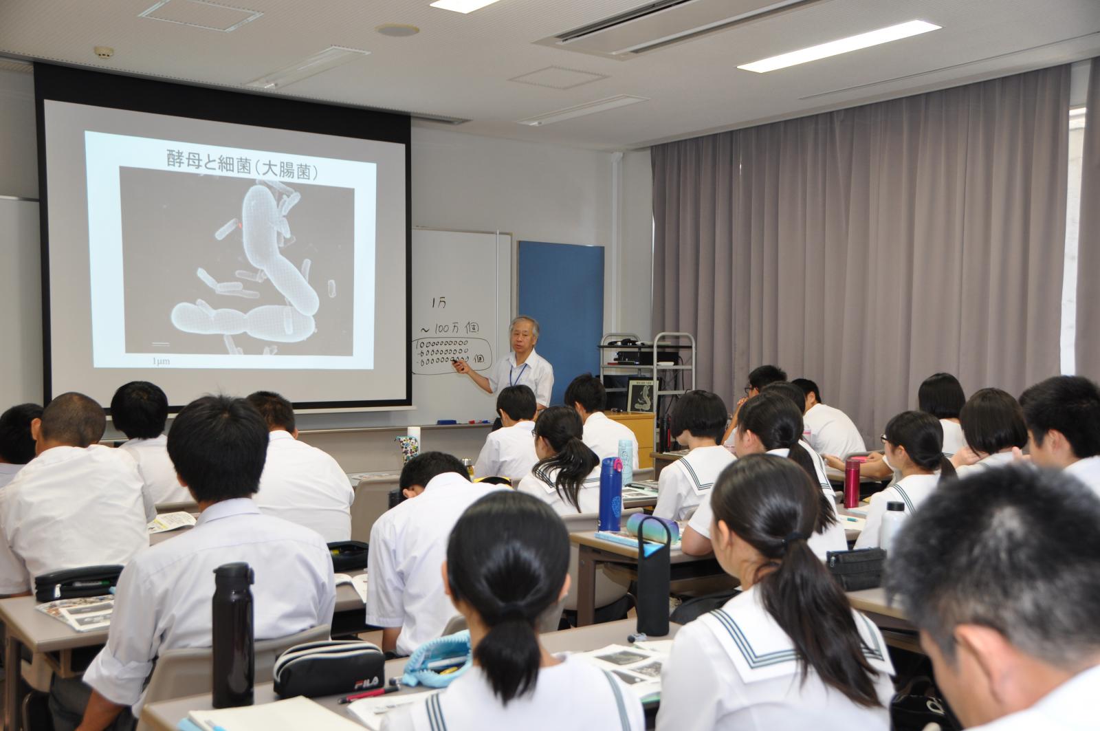 本学の概要説明や、中学・高校と大学の講義や学びの違いなどについて説明を受けたあと、生物資源科学部の福島 淳 教授(応用生物科学科)の講義を受講しました。福島先生からは、『微生物ってなんだろう』というテーマで、お話を進めていただきました。地球上にあふれる無数の微生物の一部を、写真や動画で見せていただきました。何となく耳にしたことのある微生物の名前もありましたが、目にしたのは初めてのものばかりでした。