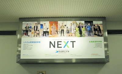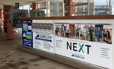 秋田駅西口(ぽぽろーど通路)、秋田空港(1F到着ロビー及び2F出発ロビー)に電光広告を掲出しました。秋田県立大学をアピールする新しいデザインに意匠変更しておりますので、是非ご注目ください。
