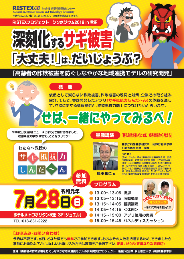 7月28日(日)、秋田市のホテルメトロポリタン秋田において、本学の総合科学教育研究センターの渡部 諭 教授が研究責任者を務める「高齢者の詐欺被害を防ぐしなやかな地域連携モデルの研究開発」プロジェクトが主催し、シンポジウム2019 in 秋田「深刻化するサギ被害 『大丈夫!』は、だいじょうぶ?」が開催されます。本シンポジウムでは、超高齢社会を迎え、特殊詐欺や悪質商法等の高齢消費者被害が深刻化している現状を踏まえ、県民の詐欺抵抗力の向上を図ることを目的に秋田県で初めて開催されるものです。