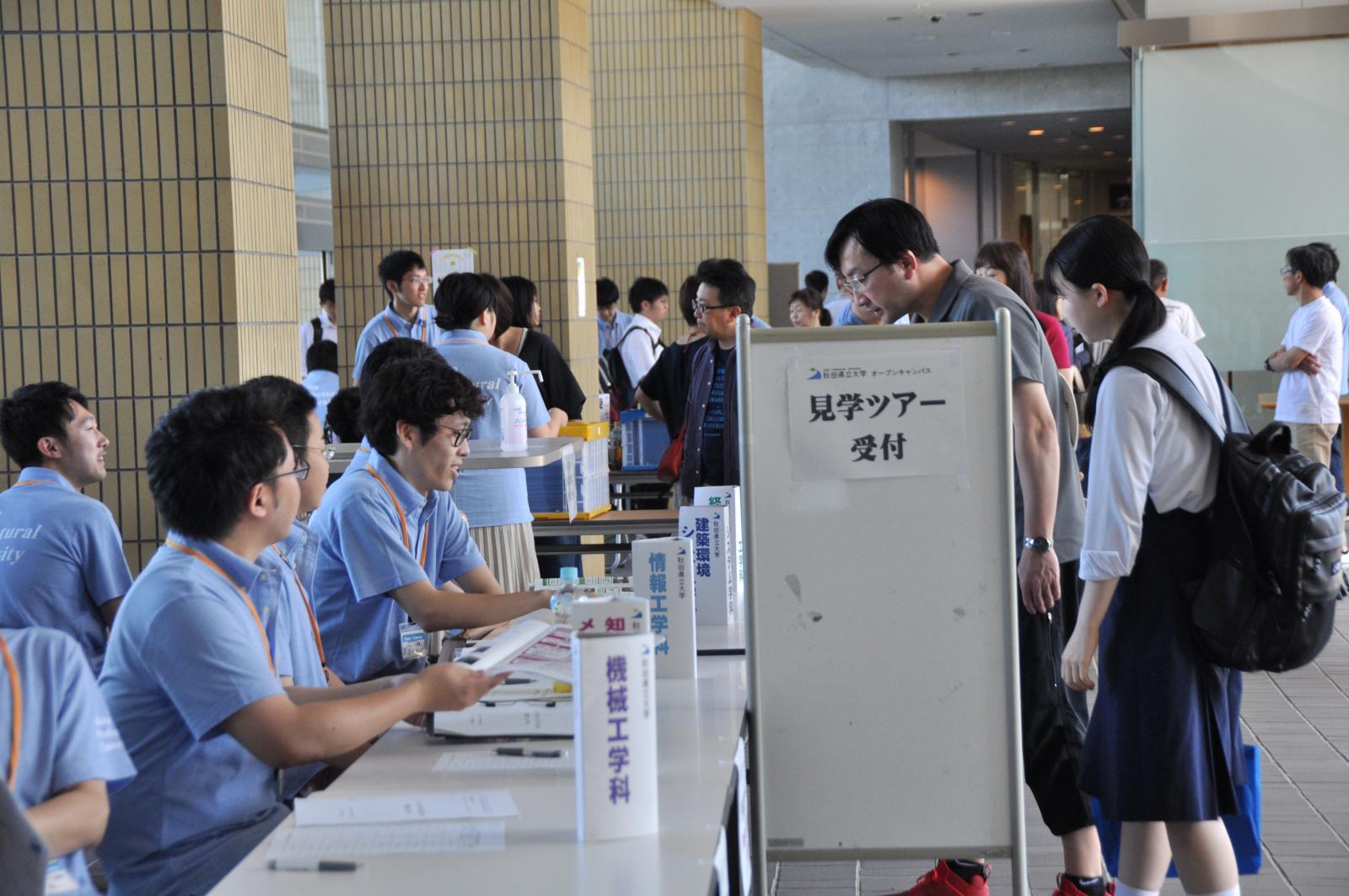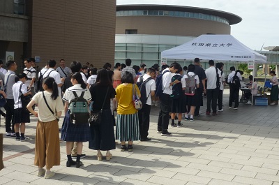 「オープンキャンパス」を7月14日(日)に生物資源科学部(秋田キャンパス・大潟キャンパス)で、15日(月)にシステム科学技術学部(本荘キャンパス)で開催し、全国各地から約800名の受験生・保護者の皆さんにご来場いただきました。県内外から来ていただいた高校生の方々やボランティアの学生スタッフの熱意もあって、キャンパス内は熱気に包まれていました。在学生が学内の各施設を案内する学内見学ツアーや、大学の授業を実際に体験できる模擬講義が大好評でした。