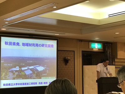 7月26日(金)、秋田市のパーティギャラリーイヤタカにおいて、本学木材高度加工研究所が後援する、公開シンポジウムin秋田「原木・原材料の安定供給と木製品の生産効率向上」が開催されました。本シンポジウムにおける基調講演では、木材高度加工研究所の林 知行所長が『秋田県発、地域材利用の研究開発』と題して、秋田林業の歴史と戦後の木質建材と木造建築の歴史の関係性、そこに紐付けられた現状や対する同研究所のこれまでの取り組みや今後の課題について語られました。