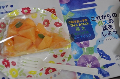 7月31日に、秋田キャンパスで、県大キャンパスミーティング(学生と学長との懇談会)が開催され、生物資源科学部の1年生4人と小林学長・吉澤副学長が懇談しました。今回の懇談会では、秋田県立大学を志望した理由や、大学生活の近況について語り合い、その上で大学に対する要望やリクエストも挙げてもらいました。