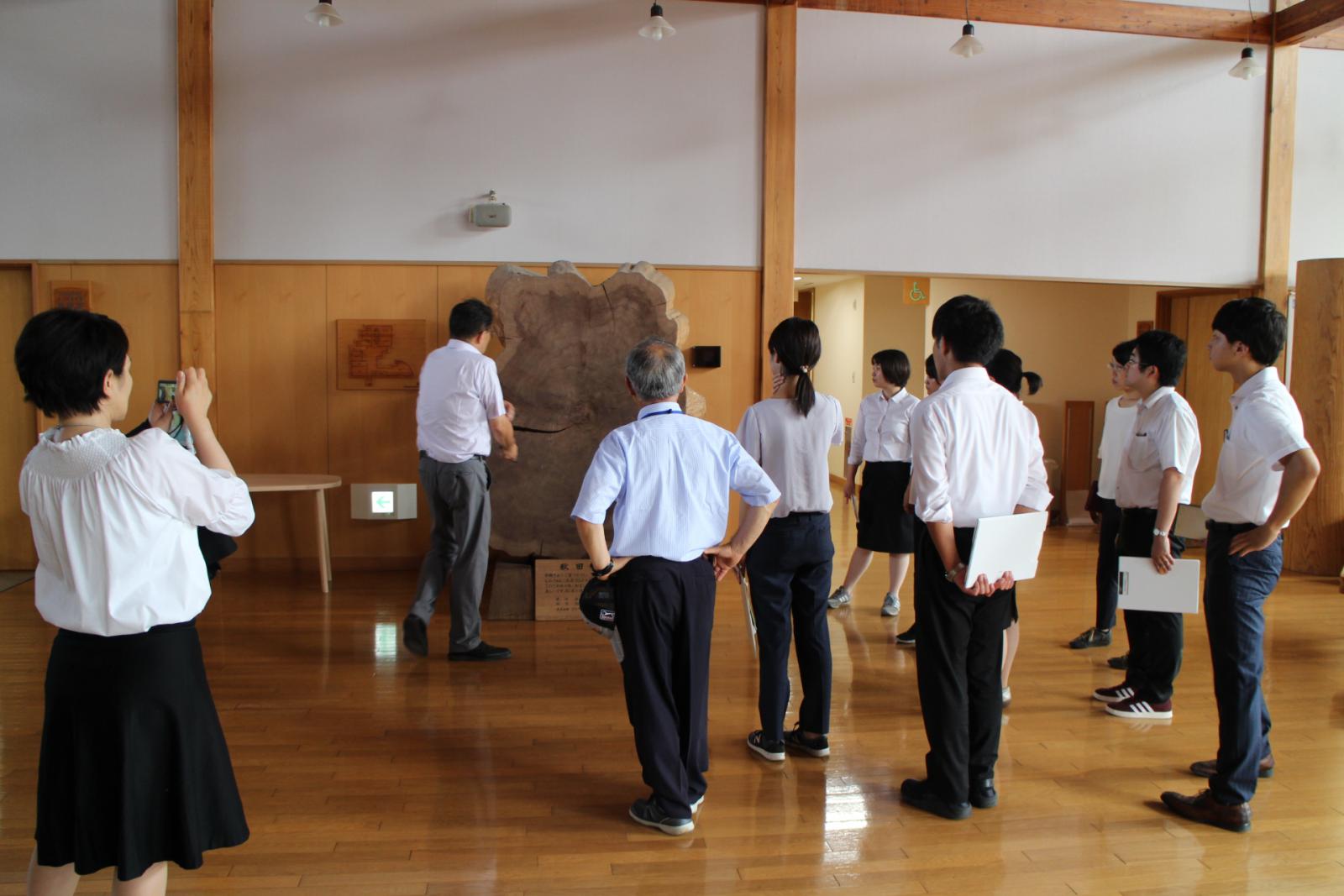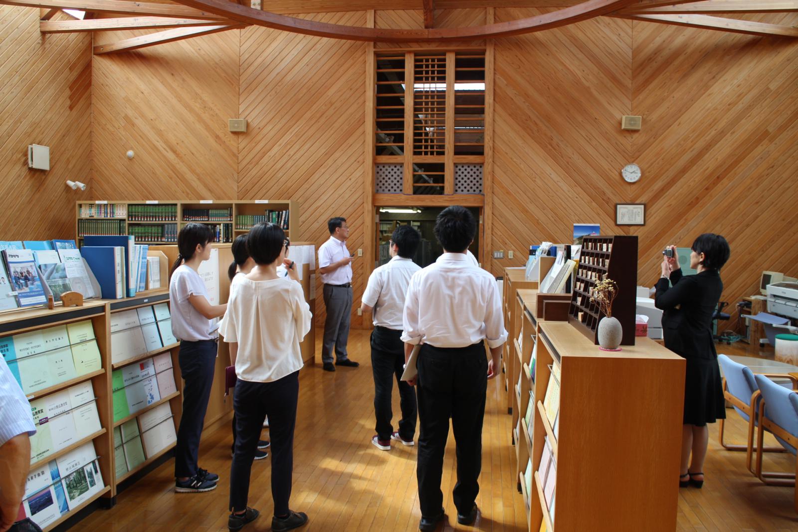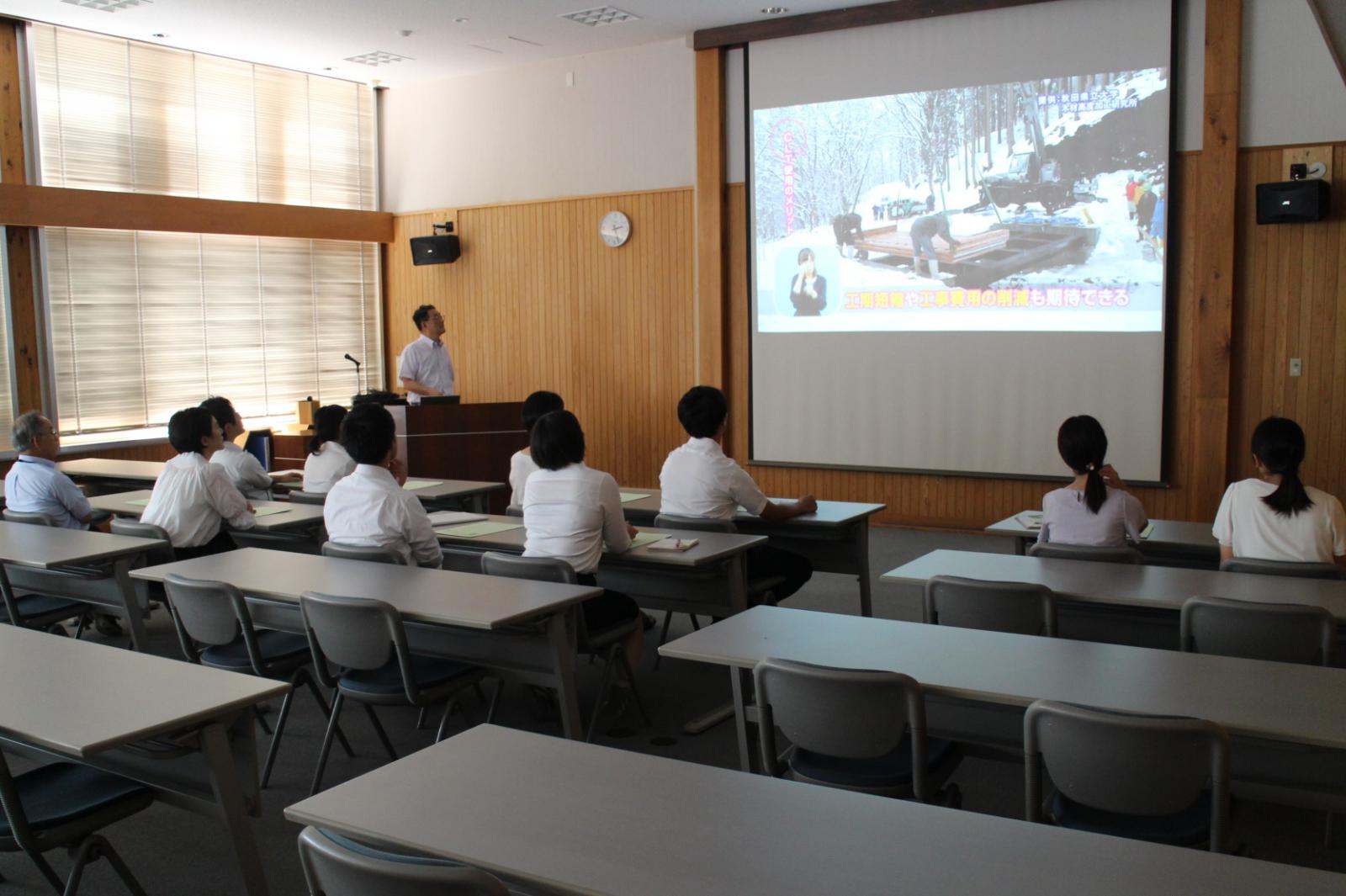 本年度、能代市の小・中学校に採用された先生の皆さんが、郷土について学び、児童生徒の教育を担当する意識を高めることを目的に、8月21日(水)、木材高度加工研究所の見学にお越し下さいました。最初に、林知行所長から、研究所の概要と、学校での木に関する教育についての講義を行いました。講義の中では「年輪の広い方が南側?」、「樹液の流れる音は聞こえる?」、「木を伐って使うことは環境破壊?」など、日頃常識と思っていたことの真偽について聴講し、先生方も目からうろこが落ちたようでした。