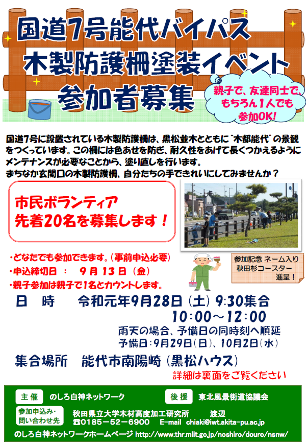 【参加者募集】国道7号能代バイパス木製防護柵塗装イベント