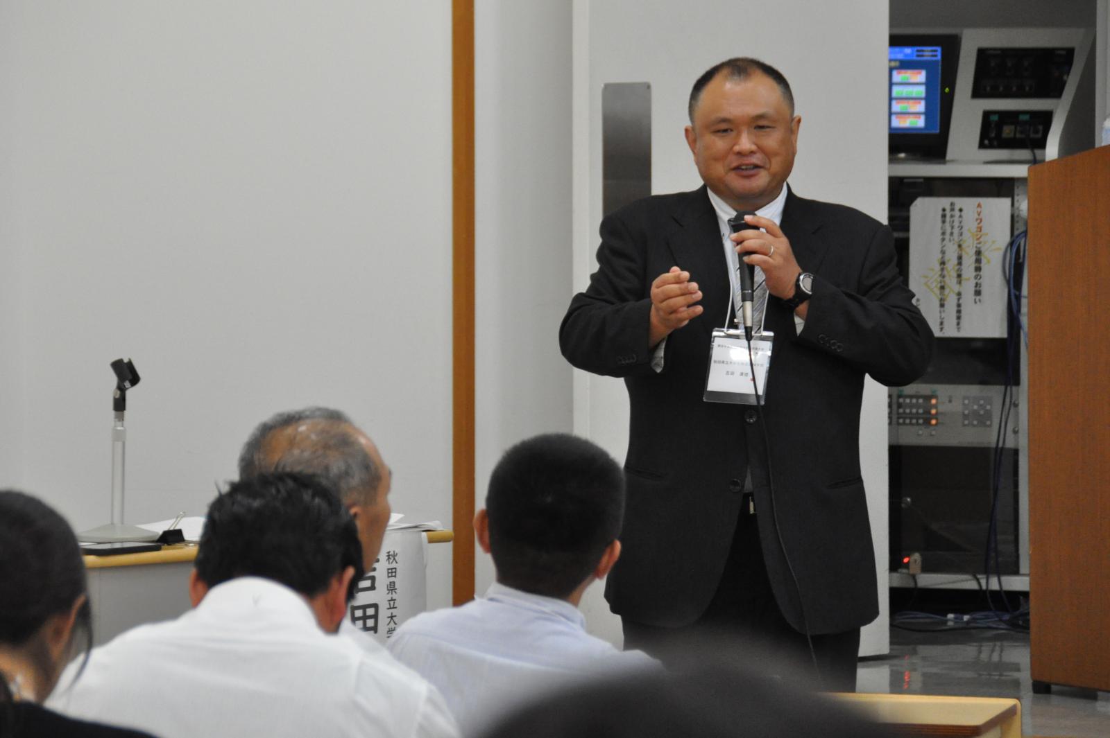 8月27日(火)、秋田市のカレッジプラザにおいて、本学と園芸学会東北支部の共催による公開シンポジウム『秋田県における新たな園芸産地の育成』が開催されました。当日は、大学等の教育関係者や学生、農業従事者、行政機関、一般市民など、県内外から約100人が参加し、基調講演や先進事例の紹介を通じて、秋田県の園芸農業の取り組みなどについて理解を深めました。基調講演では、山形大学農学部の片平 光彦 教授(農業機械学)から『園芸生産とAI技術』と題して基調講演が行われました。片平教授は、「AIやIoT、ビッグデータといった先端技術と農業技術を融合させることが、農業生産の省力化・効率化に役立つ」、また、エダマメ選別を画像処理とAIで自動化する選別装置についての紹介では、「AIに傷やシミといった規格外品の情報をより多く学習させることで、より精密な選別が可能になる。生産管理に非常に有効なツールであるため、是非、活用してほしい」と述べられました。