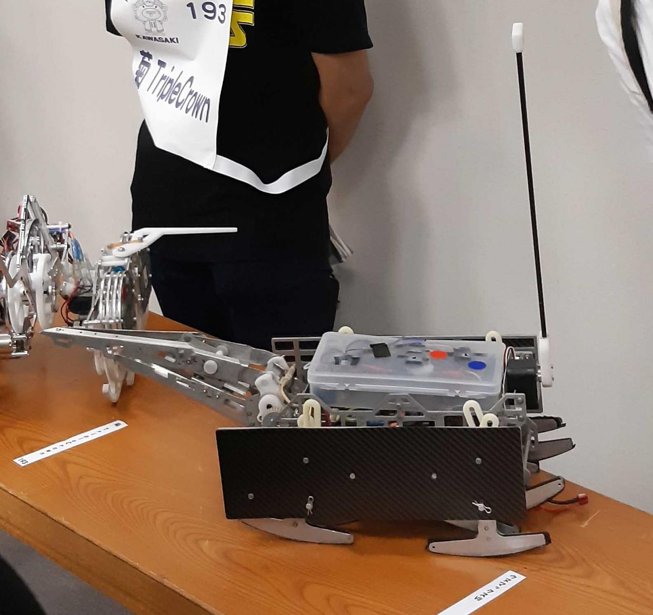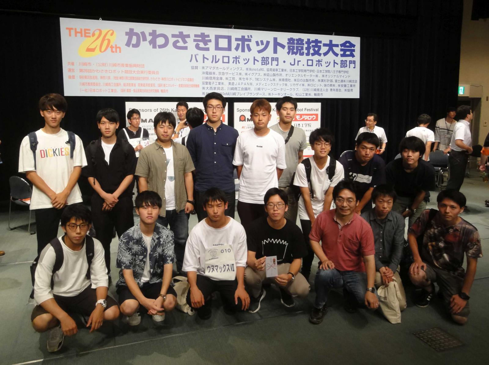 学生自主研究「高機動汎用ロボット」の3つの班と学生支援スタッフ、そして担当教員の齋藤敬准教授(システム科学技術学部知能メカトロニクス学科)が、8月23~25日に神奈川県川崎市で開催された第26回かわさきロボット競技大会に4機のロボットで参加しました。223機中、上位48機となる予選突破はいずれもなりませんでしたが、生活支援ロボ班が担当する「ウヌマックスⅦ」がユニークなロボットがデモンストレーションを行う特別戦に選抜され、特別戦出場チーム賞を受賞しました。ウヌマックスは2012年より改装を続けながら運用されているものです。今回、相手機をひっかけたり、はじき飛ばす機体が多い中、腕で掴み戦うコンセプトが評価されたとのことでした。大会には最初の設計者である自主研OBの宇沼尚吾さんも来場しており、在学中の努力が思わぬ形で評価され、感慨深い様子でした。