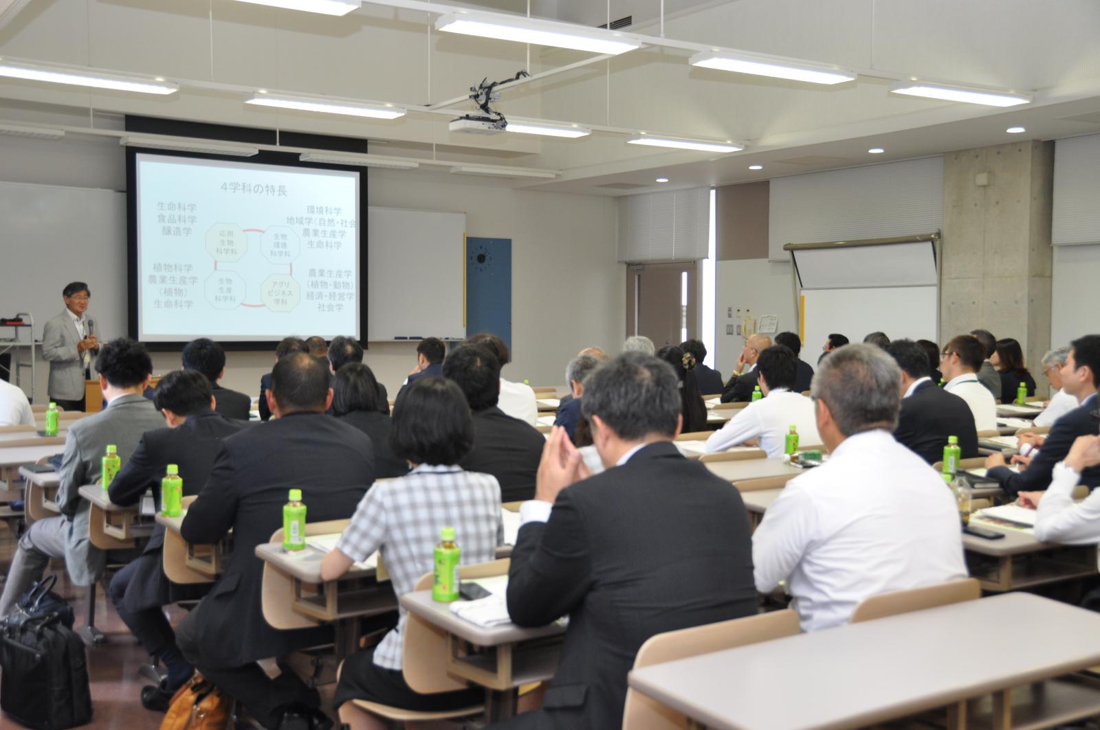 第一部では、生物資源科学部の金田吉弘学部長より、本学部の教育・研究の特色や学生の育成について、キャリア支援チームの野﨑敏雅チームリーダーより、最近の就職活動の傾向等についてそれぞれ説明いたしました。