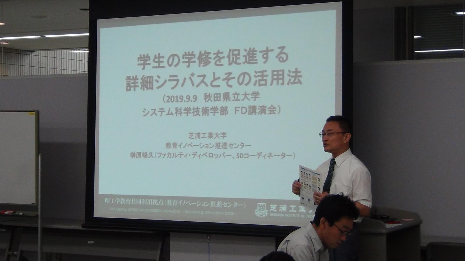 9月9日(月)、本荘キャンパスにて、システム科学技術学部ファカルティ・ディベロップメント(FD)講演会を開催しました。講師に芝浦工業大学 教育イノベーション推進センターの榊原 暢久 教授をお招きし、「学生の学修を促進する詳細シラバスとその活用法」と題して、約2時間にわたってご講義を行っていただきました。講義では、榊原氏が授業で実際に使用している「詳細シラバス」を参考にしながら、参加した教職員がシラバスを作成する際に感じている課題とその打開策について、グループワーク形式で考えました。また、講義終了後の質疑応答では、活発な意見交換が行われました。
