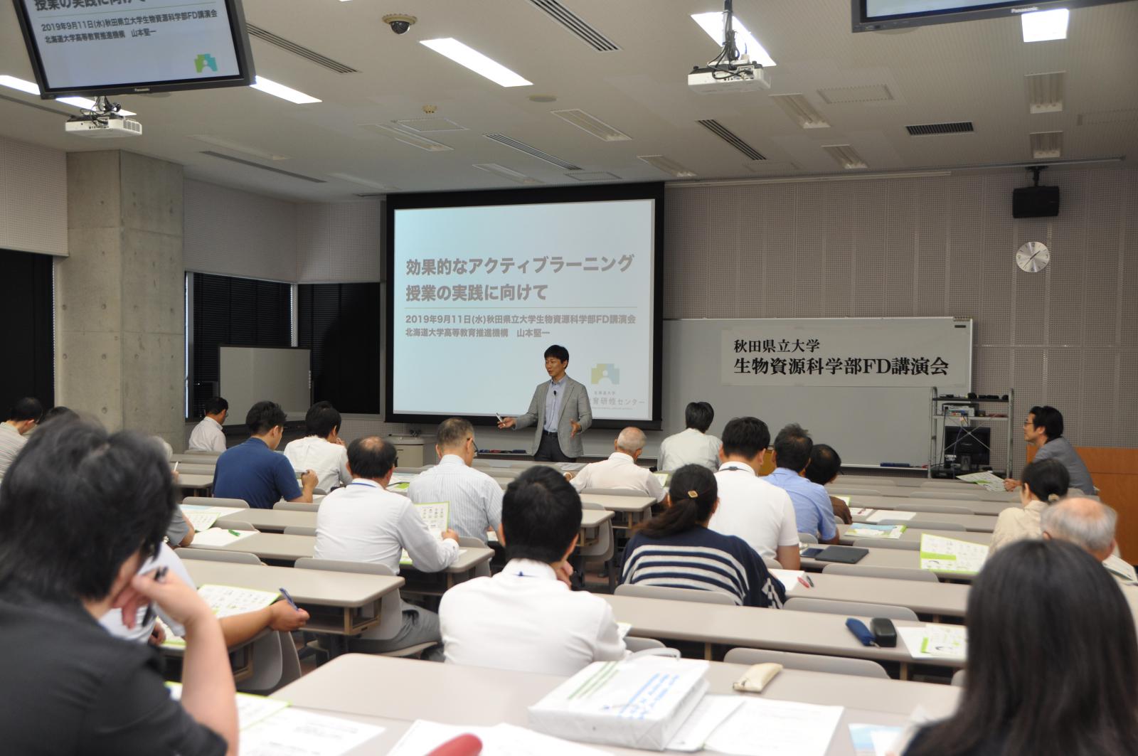 9月11日(水)、秋田キャンパスにおいて生物資源科学部ファカルティ・ディベロップメント(FD)講演会を開催しました。今回の生物資源科学部FD講演会では、北海道大学高等教育推進機構高等教育研修センターの山本 堅一 特任准教授をお招きし、『効果的なアクティブ・ラーニング授業の実践に向けて』と題して、ご講演をいただきました。