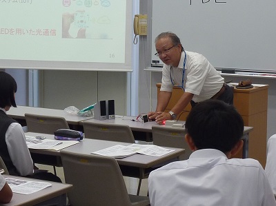 その後、システム科学技術学部の礒田 陽次 教授(知能メカトロニクス学科)による模擬講義が行われました。礒田先生からは、『メカトロニクス』入門』というテーマで講義を進めていただき、実際に光回線を用いた実験も行われました。高校生の皆さんは、普段受けることのない大学の授業・実験に、真剣な眼差しで受講されていました。
