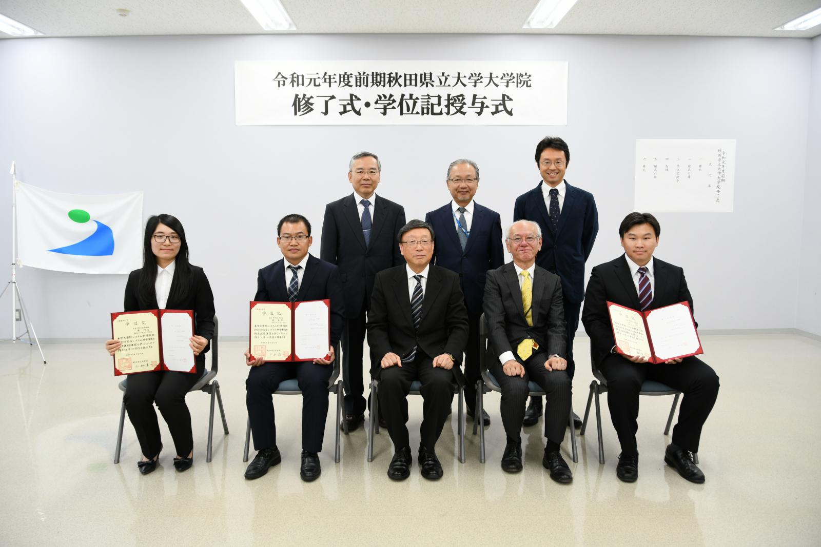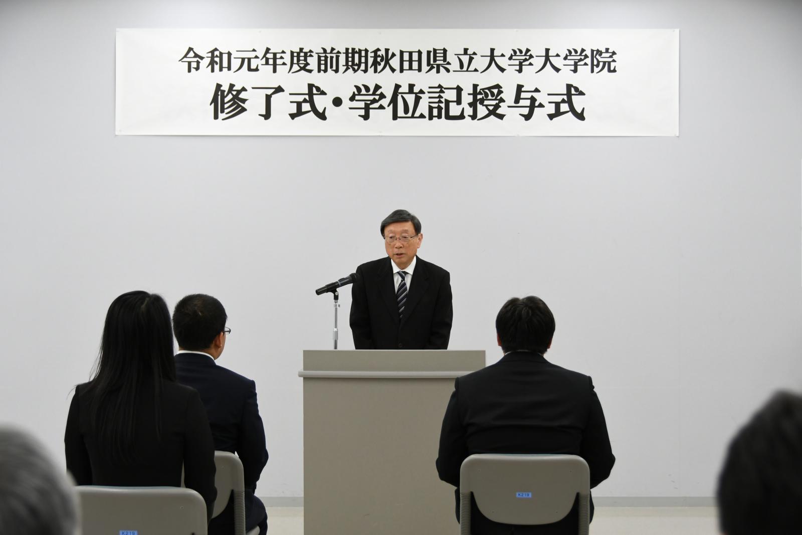 令和元年度前期大学院修了式を執り行いました 9月25日、本荘キャンパスにおいて令和元年度前期大学院修了式・学位記授与式が執り行われ、大学院生3名が新たなる決意と希望を胸に修了しました。 学位記授与後、小林学長は告辞の中で3名の修了生が取り組んできた研究の内容に触れながら、「本学で成果を出した経験を糧にしてそれぞれの立場で活躍されることを期待するとともに、これからも本学をサポートして欲しい」と修了生を激励しました。 小林学長による告辞 記念撮影