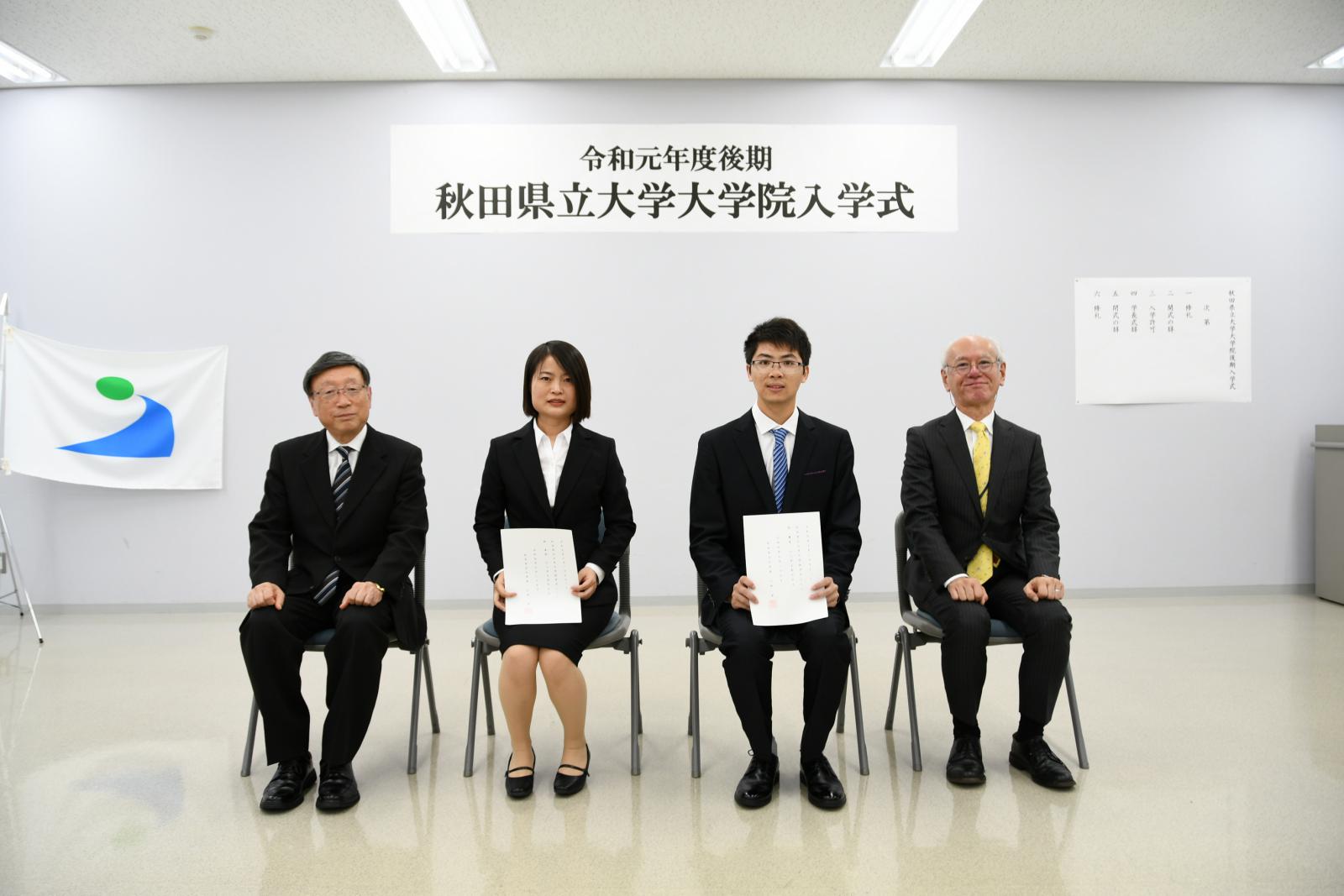 令和元年度後期大学院入学式を執り行いました 9月25日(水)に令和元年度後期大学院入学式が行われ、大学院生3名(博士後期課程3名)の入学が許可されました。 式では、小林淳一学長が「大学院後期課程では、研究背景やアプローチ方法、研究成果の社会への還元など、多くのことが求められるようになる。今後秋田県立大学での研究生活の中で、より広い視野を持ち、勉学と研究に励んで欲しい」と式辞を述べられました。