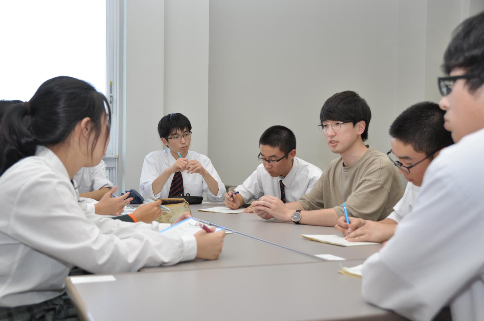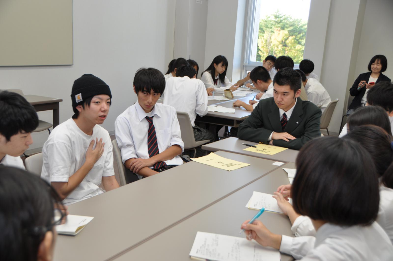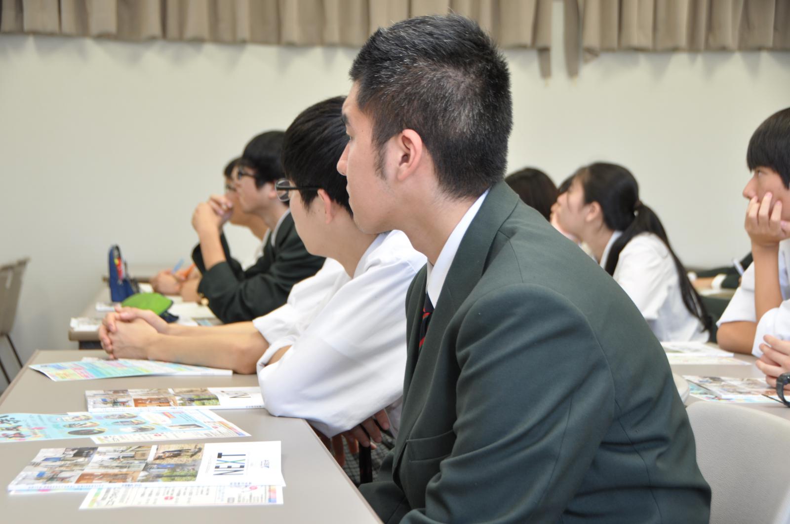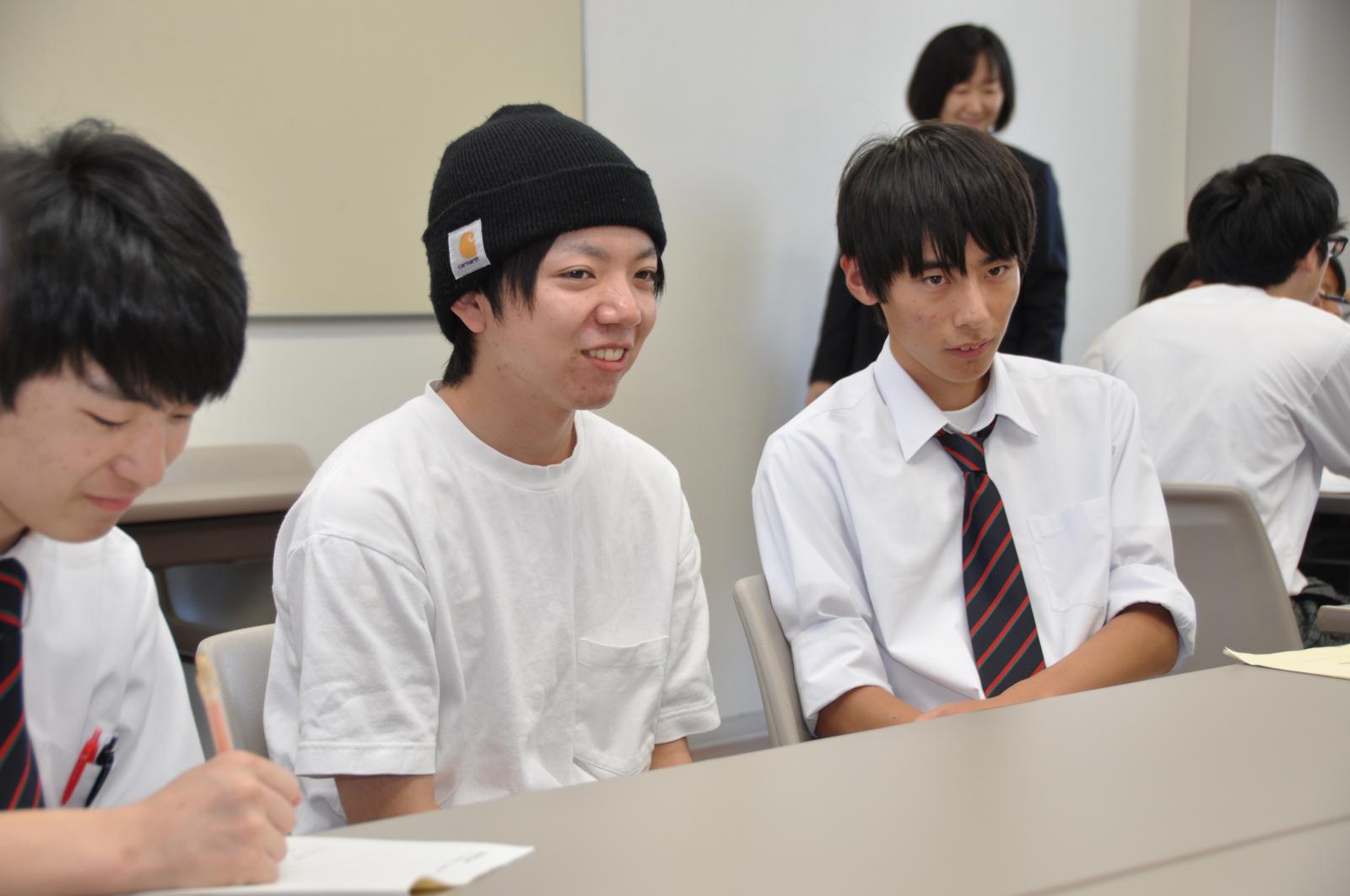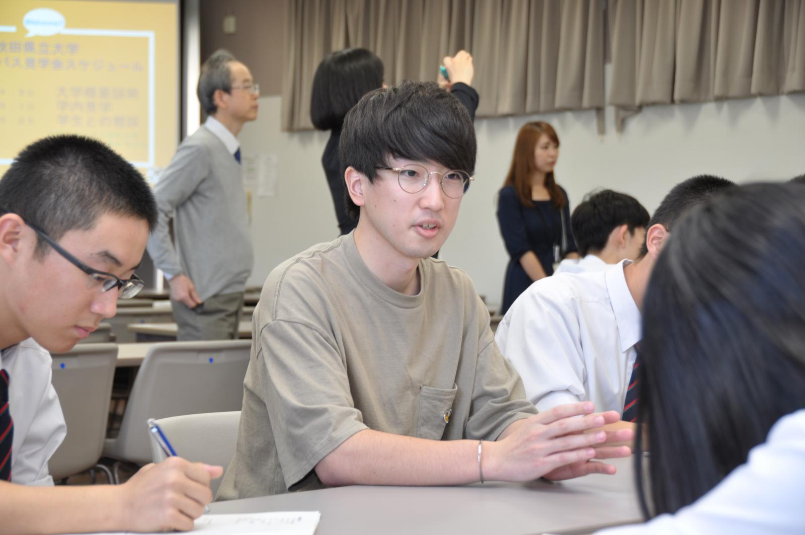 キャンパス見学ツアーを行った後、アグリビジネス学科4年の高橋洸希さんと鈴木怜さんと懇談しました。高橋さんと鈴木さんからは、県立大学でのキャンパスライフ、受験勉強をどのように進めたか、県立大学を志望した理由、将来の夢など熱くお話しいただきました。高校生からは多くの質問が出され、和気あいあいとした雰囲気の中で懇談しました。
